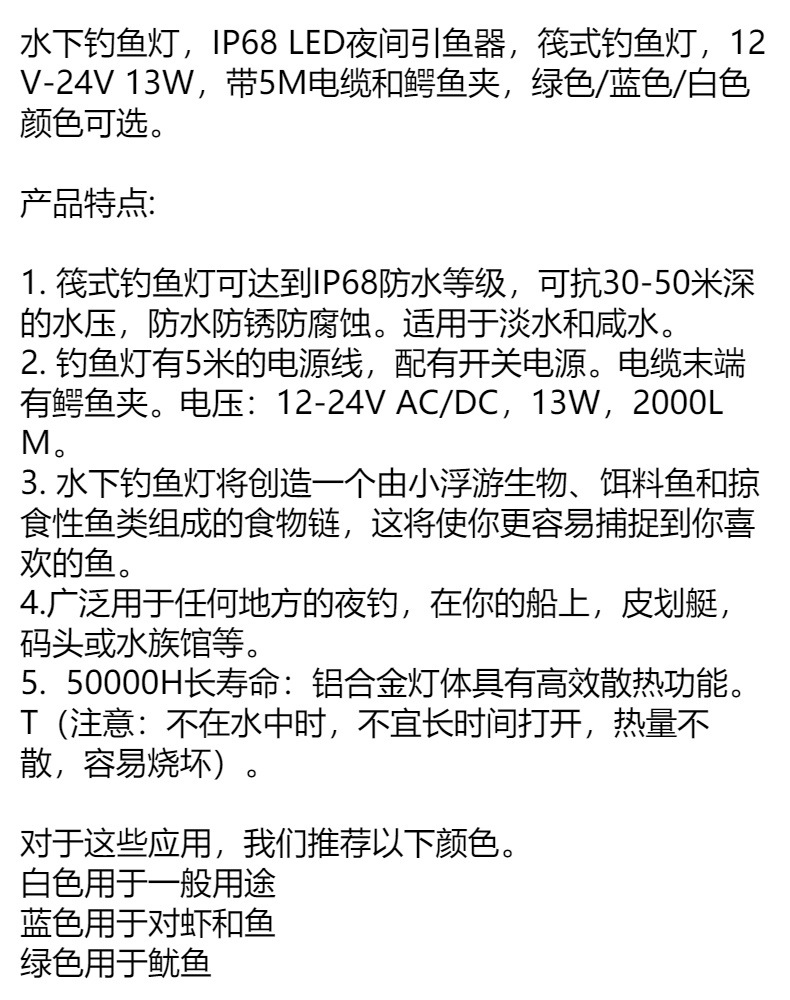 新型12V IP68 13w防水LED誘魚灯集魚灯釣り灯水中灯