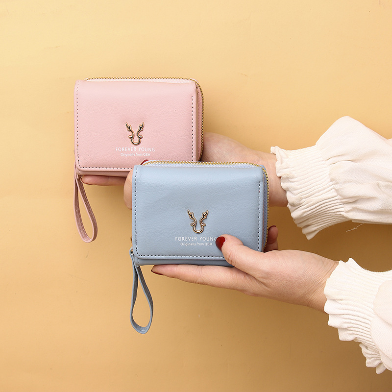 新品レディース財布puレザーショートタイプ鹿角財布ミニジッパー小銭入れ漫画三つ折りバックルカードケース
