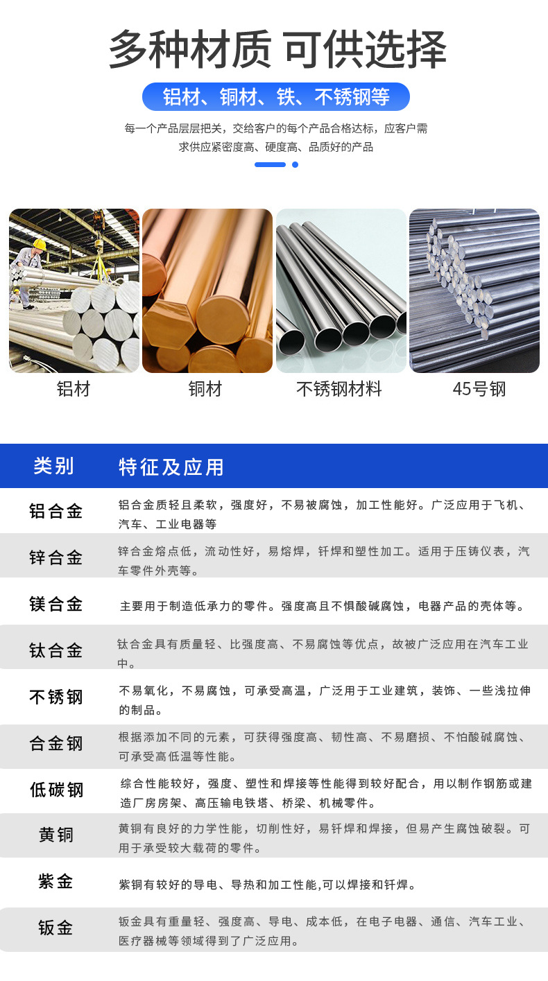 加工材料 ステンレス鋼,アルミニウム合金,銅,チタン合金,鉄,アルミニウム,真鍮,鉄の板,炭素鋼,ブロンズ,ステンレス鋼板,赤銅,アルミニウム,アルミニウムプロファイル,ステンレス鋼など,特殊鋼,タングステン合金,アルミニウム合金など,ギア鋼,耐熱鋼,高温合金,40CrMo/304