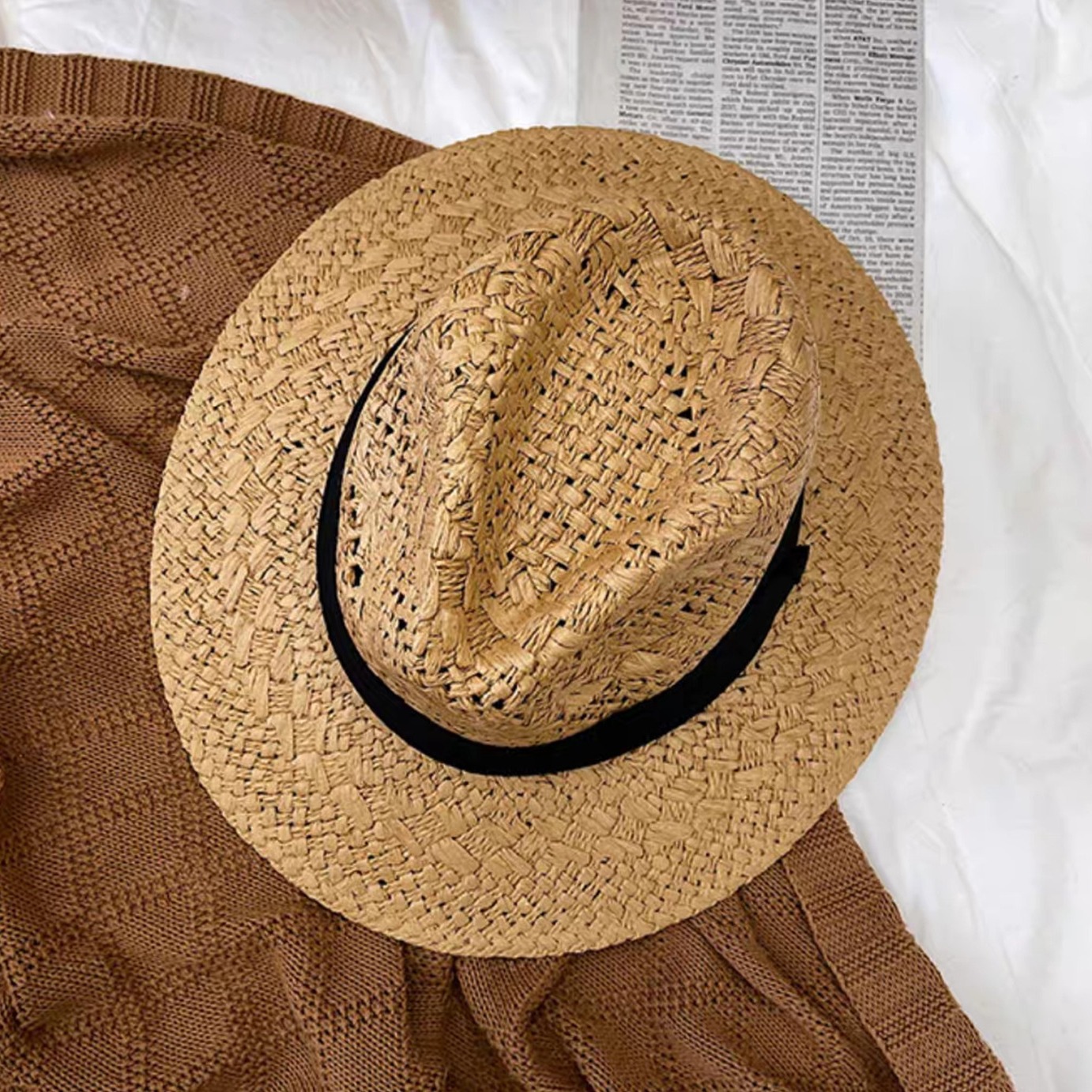 平頂の麦わら帽子の女性のフランス式の草編みの帽子2025新型の夏の大きい軒の日よけの帽子の海辺の休暇の日よけの帽子