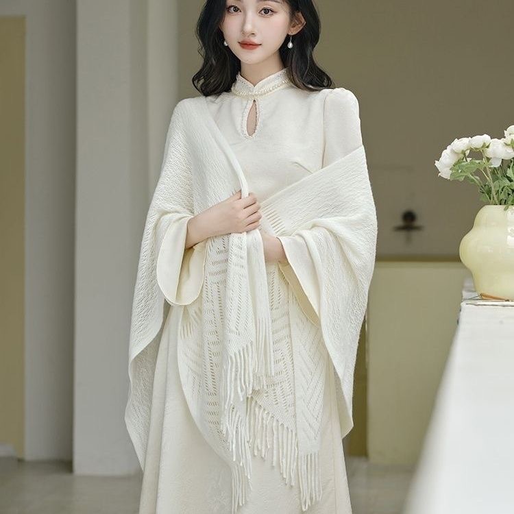新しいスタイルの中空タッセル多用途オフホワイトショールチャイナドレス付き中華民国スタイルマントスカーフエアコンシャツ旅行カーディガン