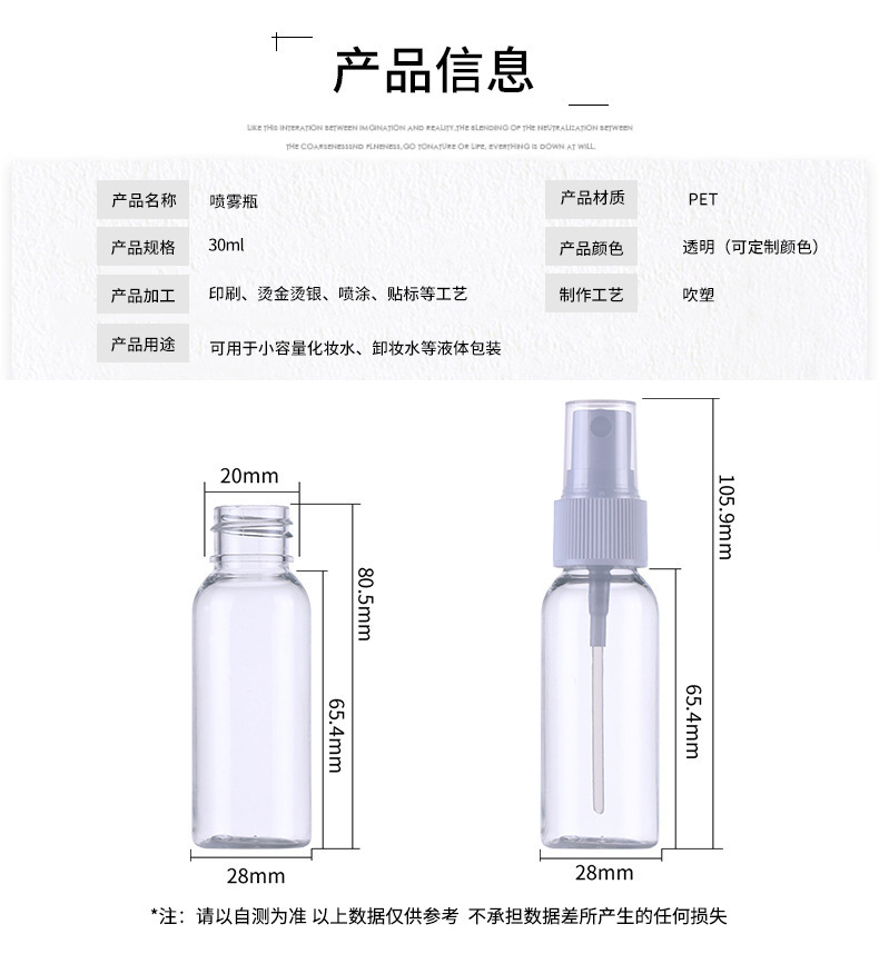 30ml化粧品ボトル使い捨て透明プラスチックpet香水スプレーボトル