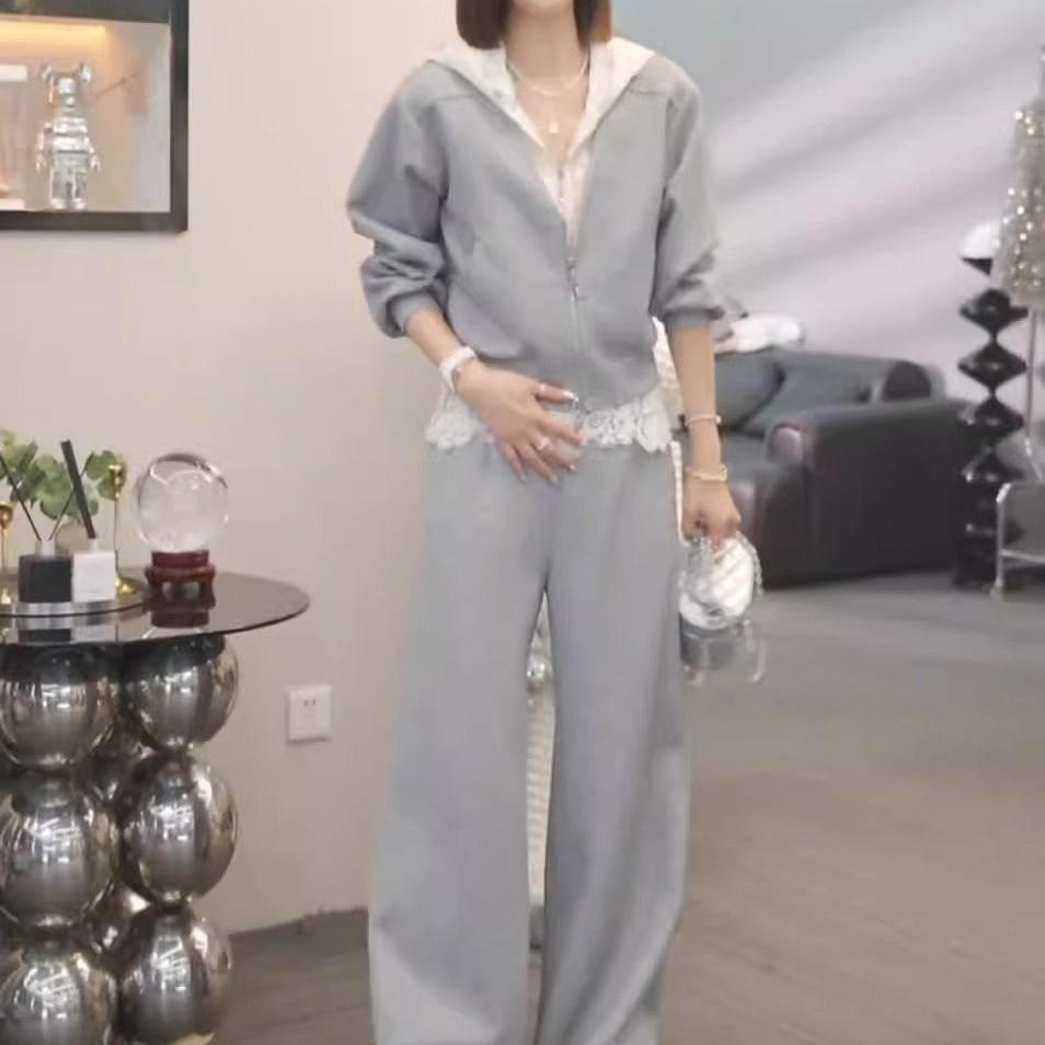 今年の人気の婦人服スーツ2025韓国風ハイエンドスプライシングレースフード付きスウェットシャツ+カジュアルパンツ2点セット