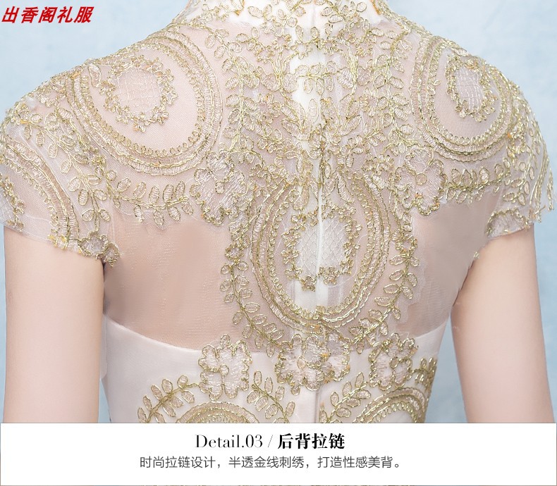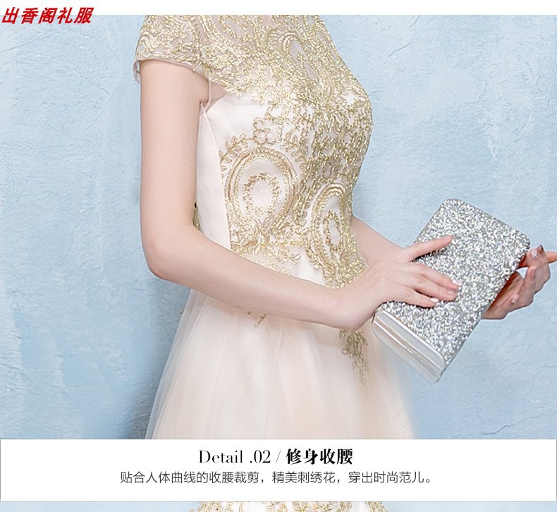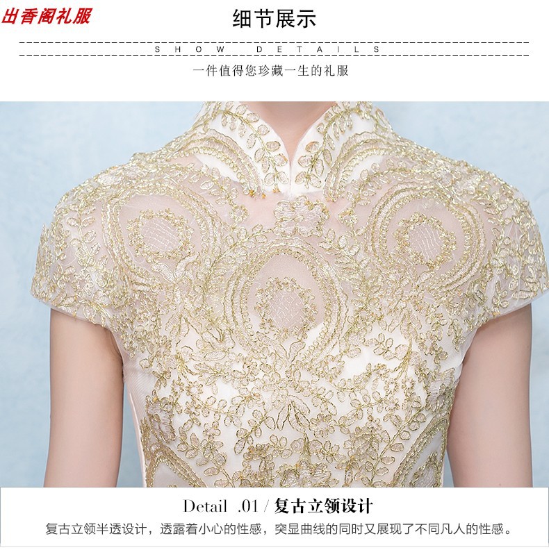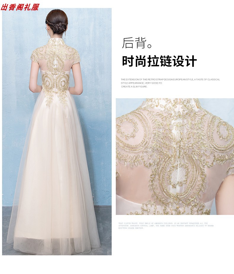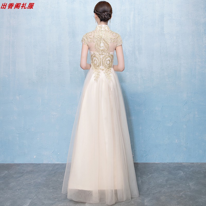 新しい中国式の婚約タキシードの女性司会者の夏のシャンパン色の高級な軽豪華な乾杯服の花嫁の長袖はやせています。
