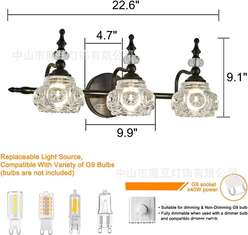アマゾンアメリカ3灯化粧灯浴室鏡ヘッドライト水晶ガラスランプカバーレトロなベッドの壁灯g 9新型