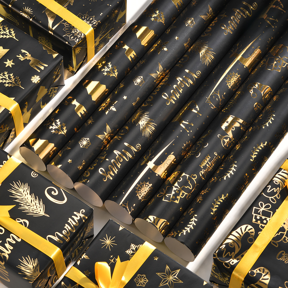 国境を越えた人気のクリスマスブラックゴールドギフト包装紙漫画クリスマス鹿スノーフレーククリスマスギフト包装紙卸売