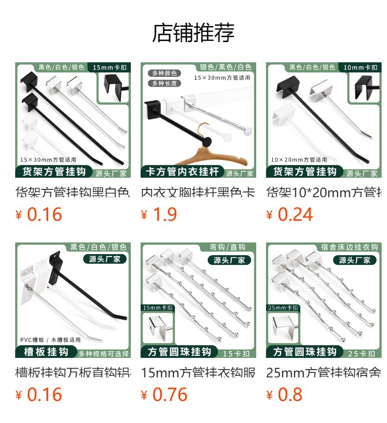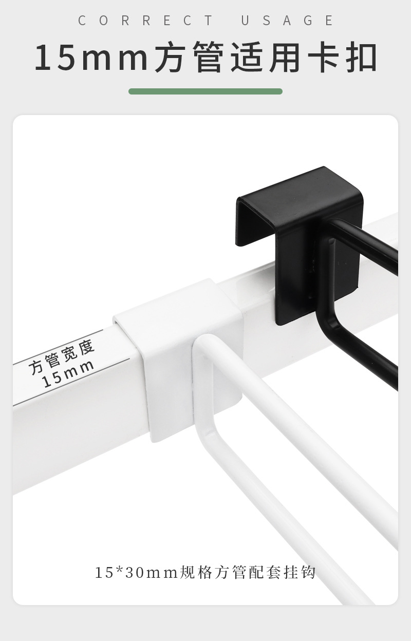15mm角管ハンガー洋服店デパート太5珠7珠フックカード角管1.5センチ横棒直曲フック