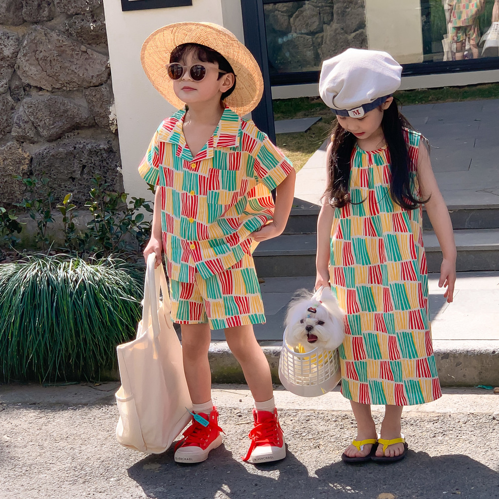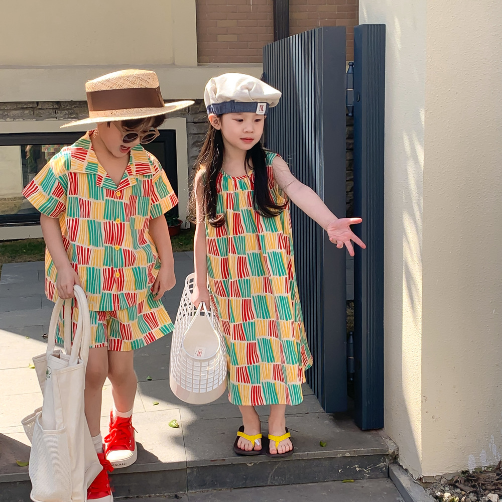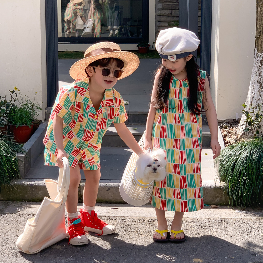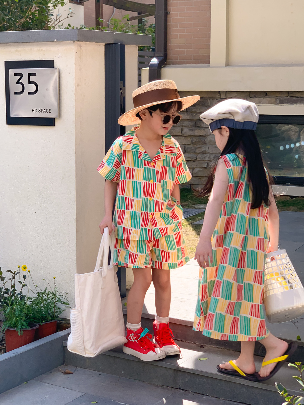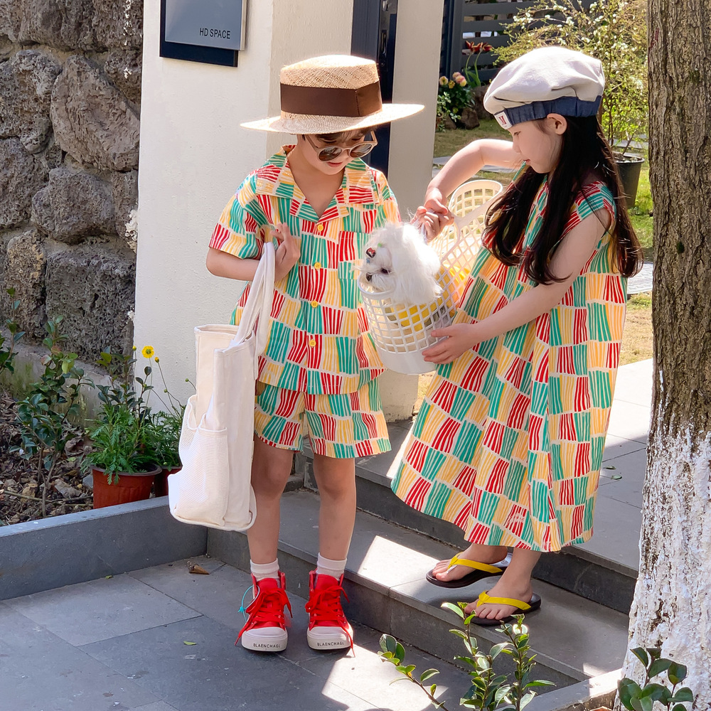 子供用ワンピース2026夏韓国風無地サスペンダーワンピース子供用半袖ショートパンツチェック柄シャツ兄弟お揃いコーデ