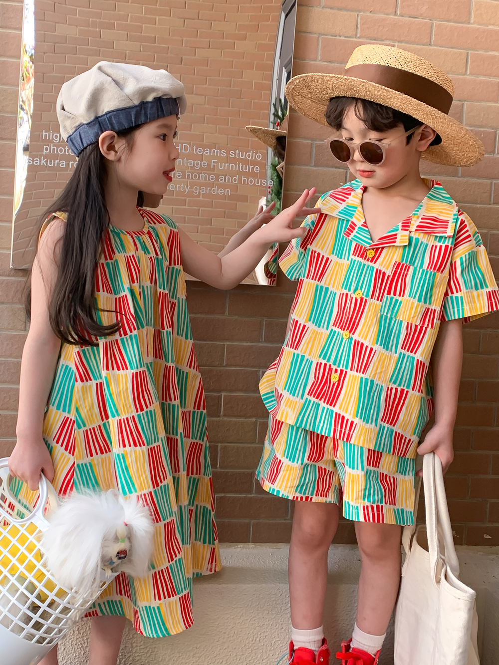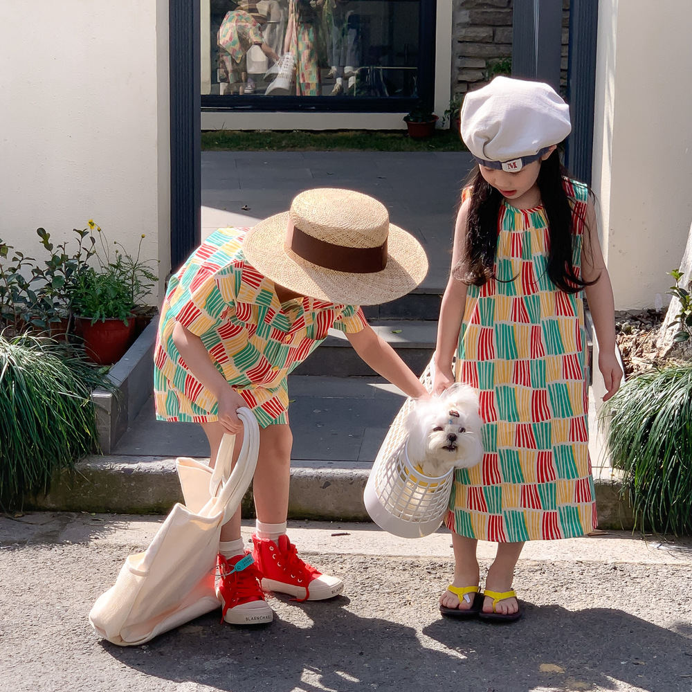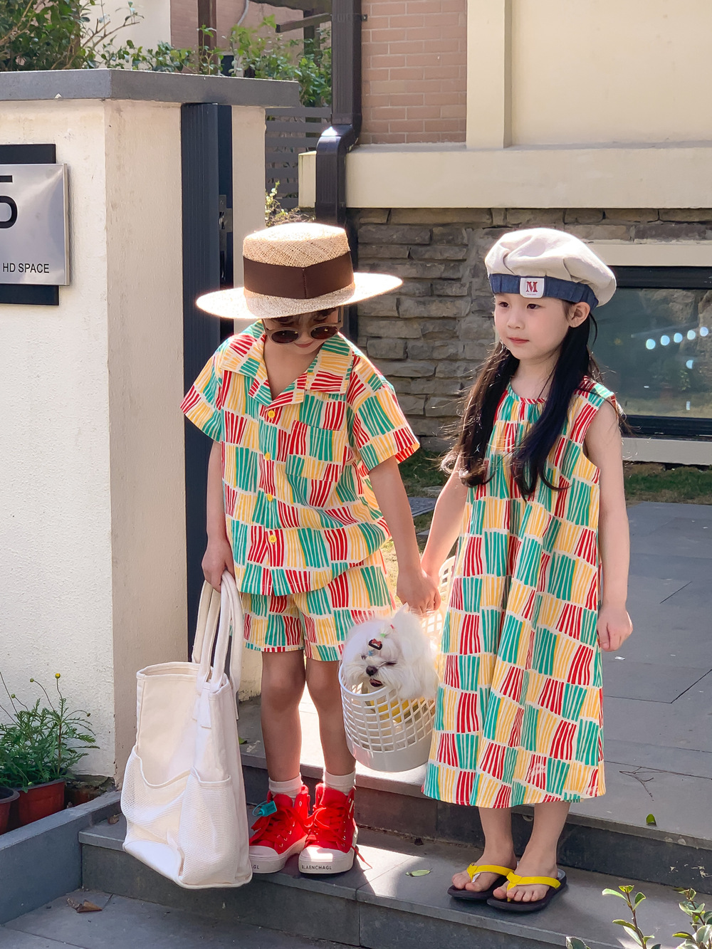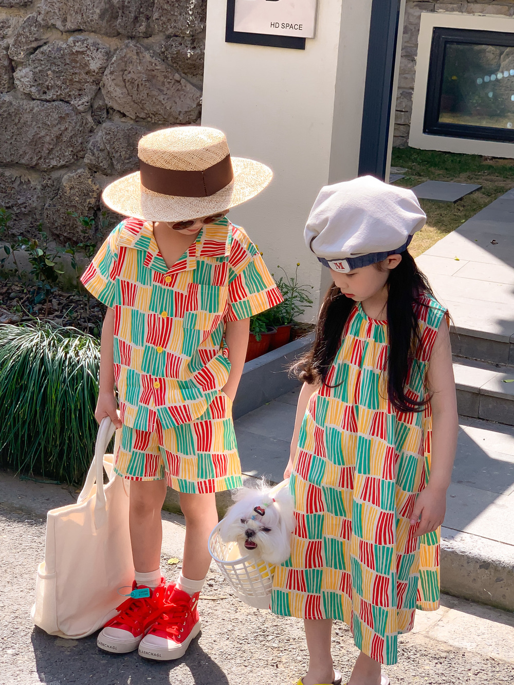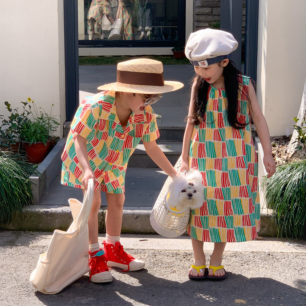 子供用ワンピース2026夏韓国風無地サスペンダーワンピース子供用半袖ショートパンツチェック柄シャツ兄弟お揃いコーデ