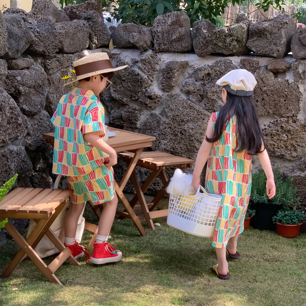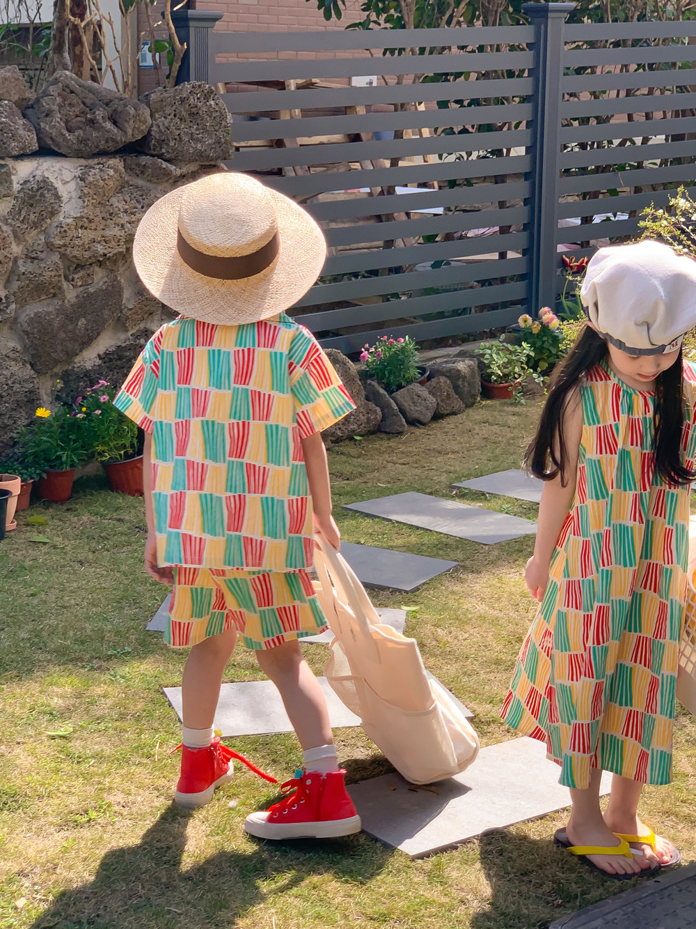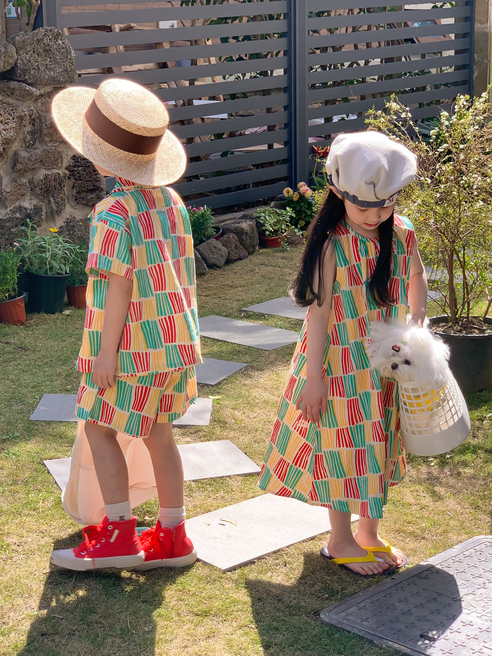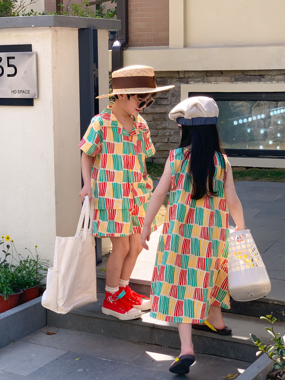 子供用ワンピース2026夏韓国風無地サスペンダーワンピース子供用半袖ショートパンツチェック柄シャツ兄弟お揃いコーデ