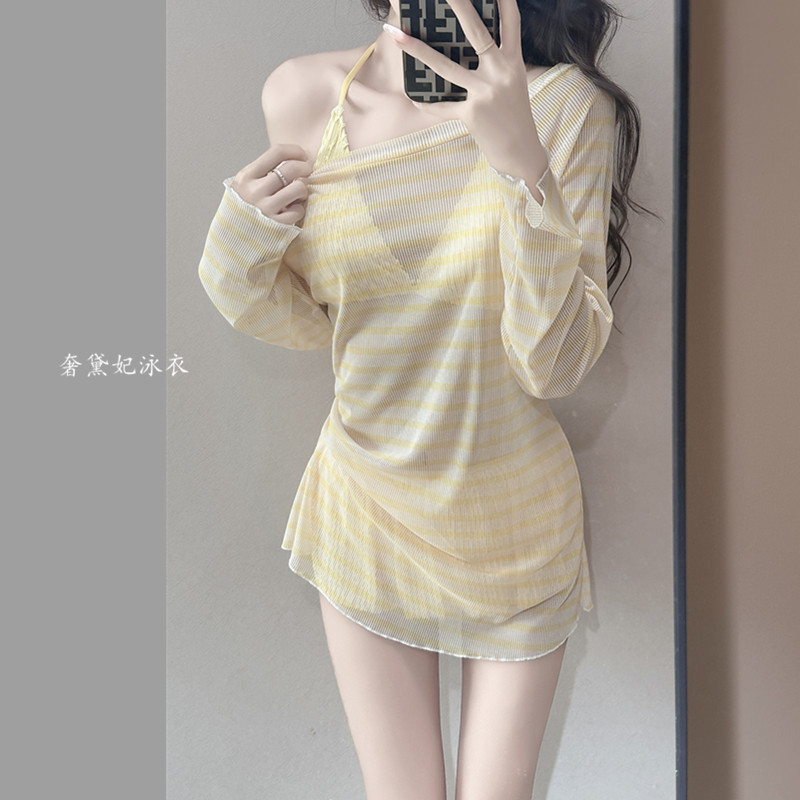 高颜值拍照慵懒纯欲长袖罩衫防晒比基尼条纹分体泳衣海岛度假温泉