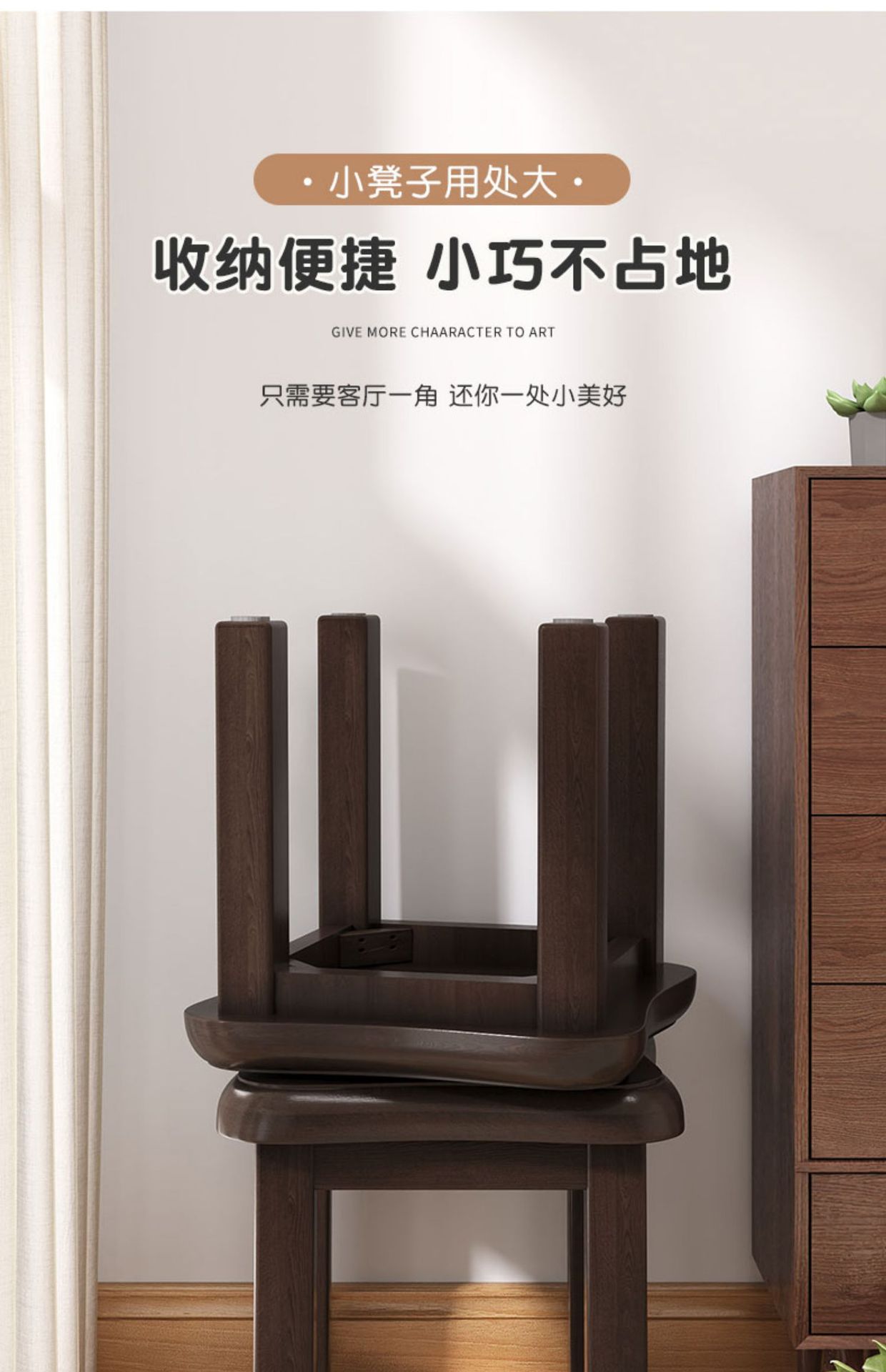 木の腰掛けは畳んでリビングに置くことができます。