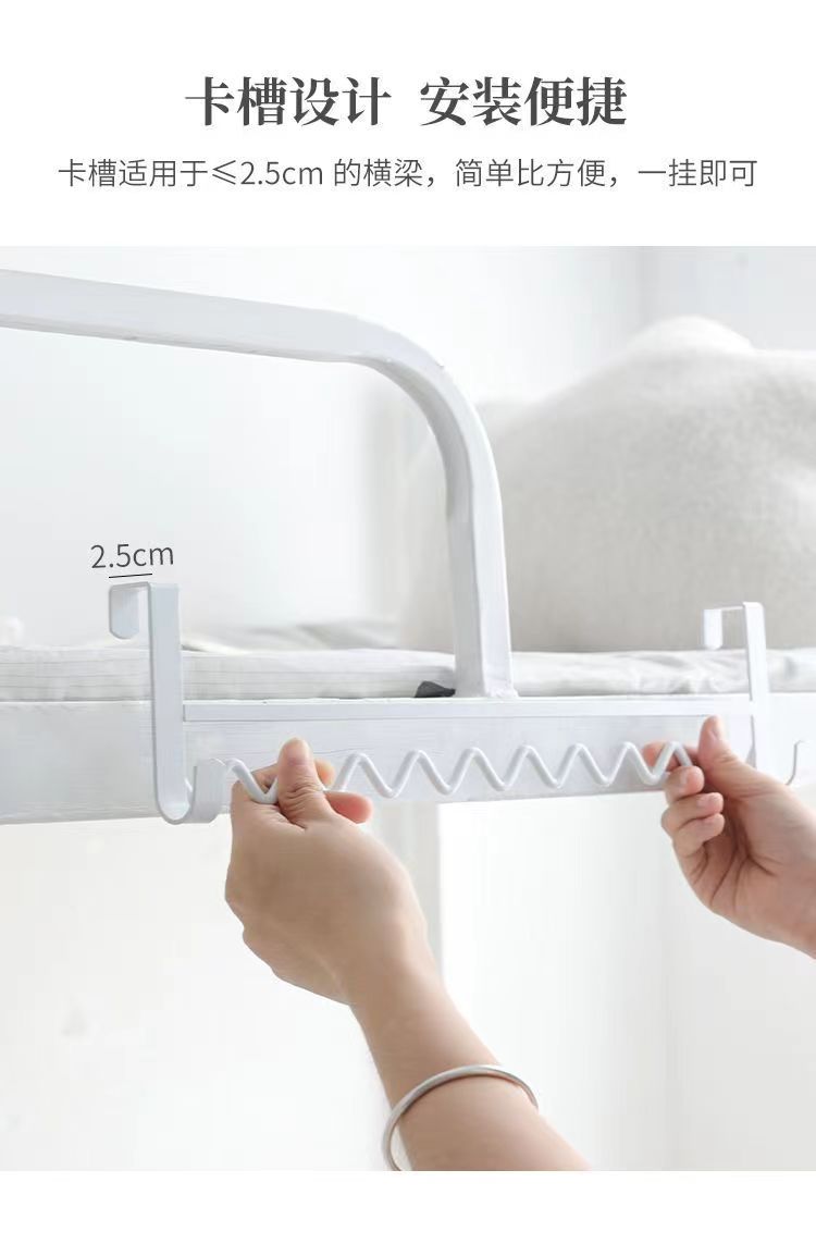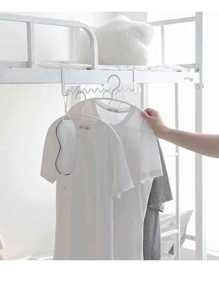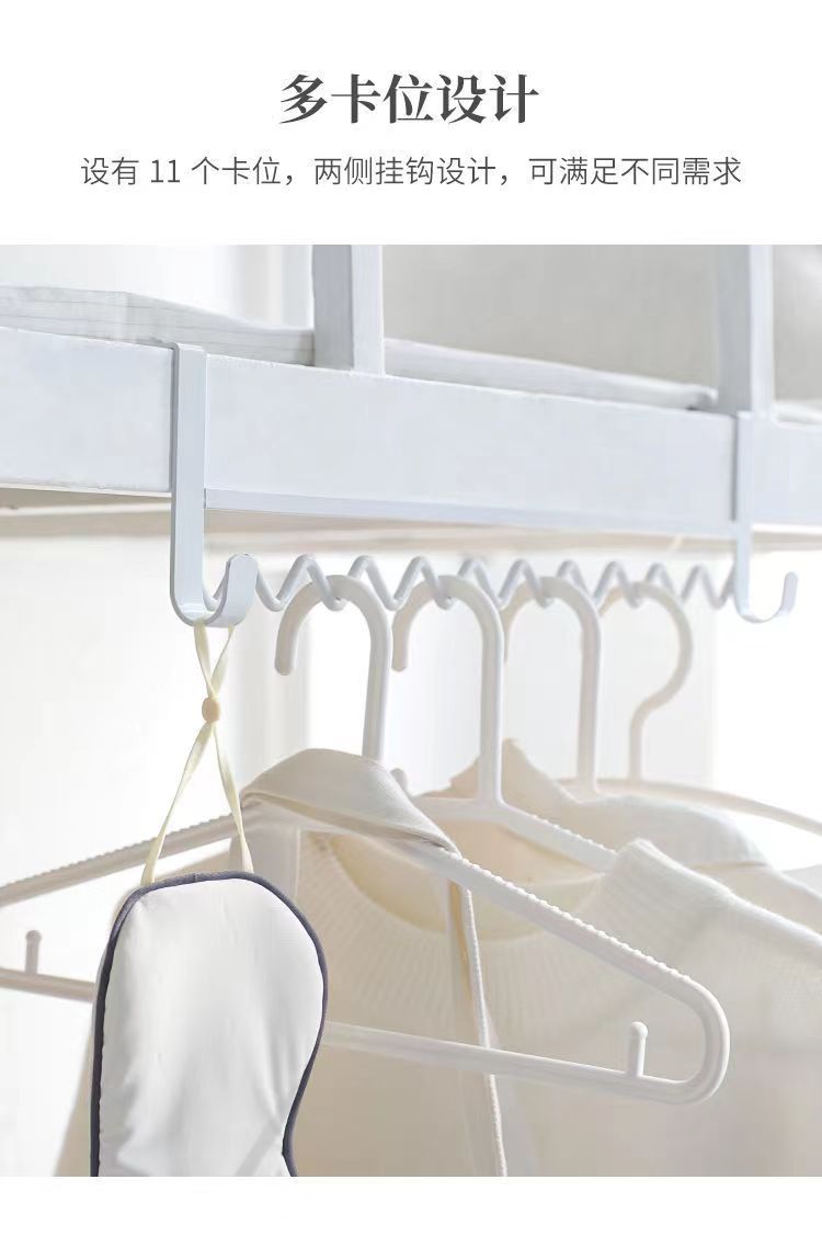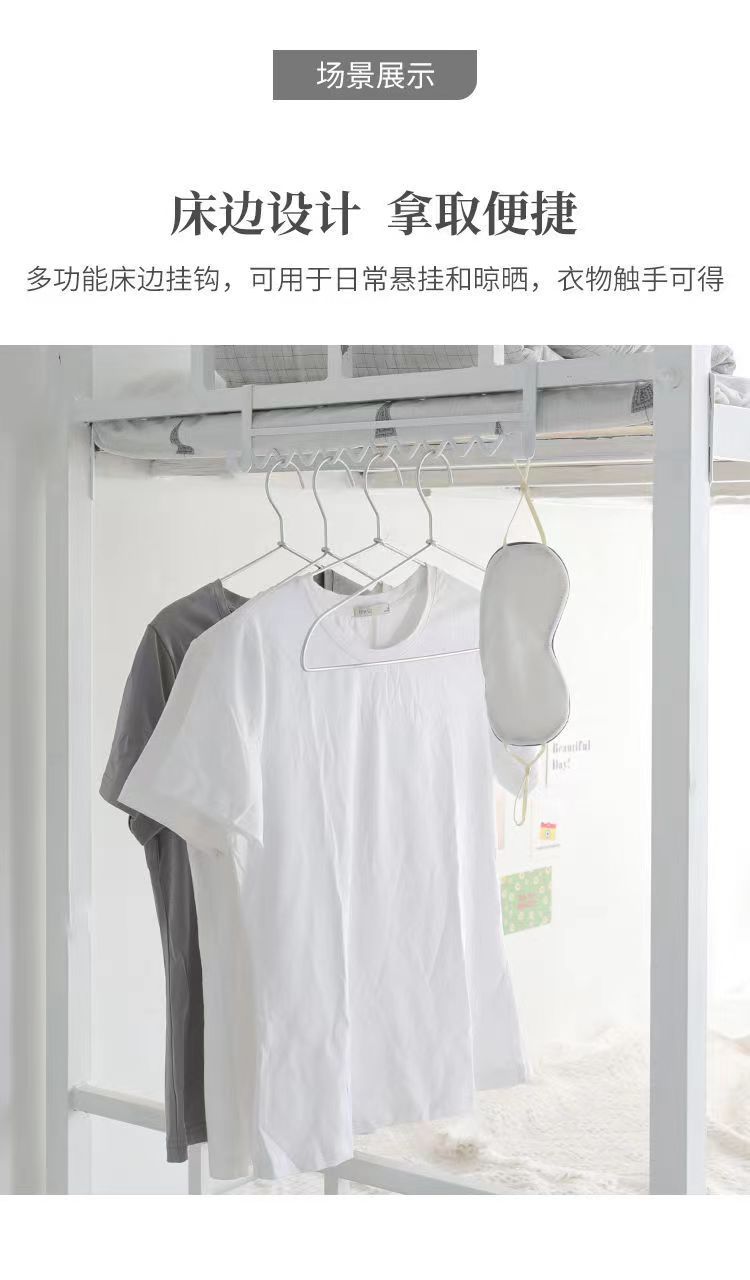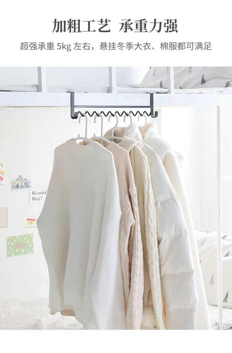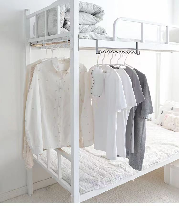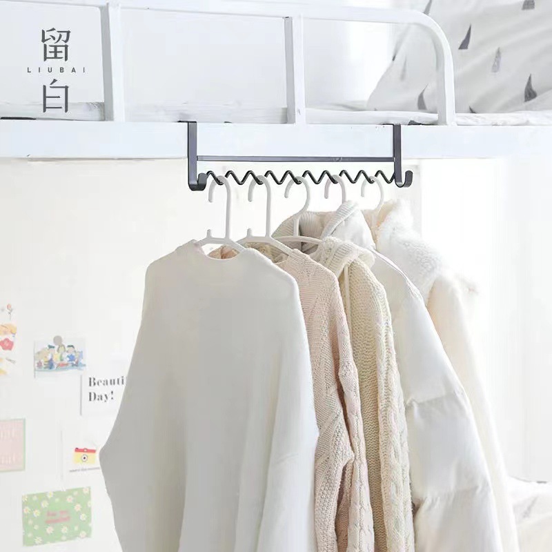 大学生の寮に服を掛けている神器の上に物置棚の波を敷いて服を掛けます。