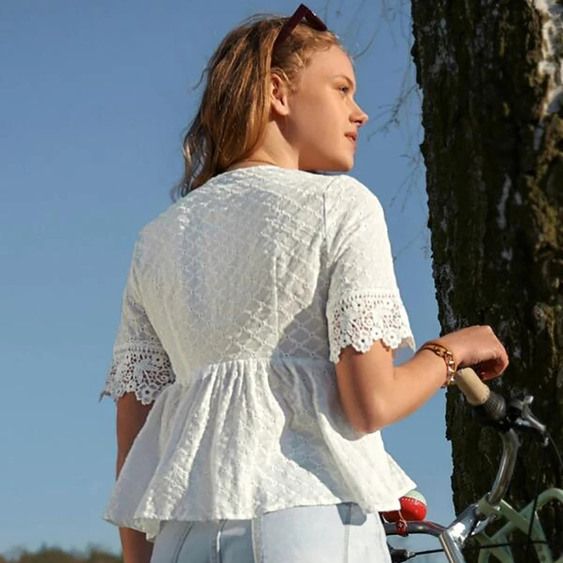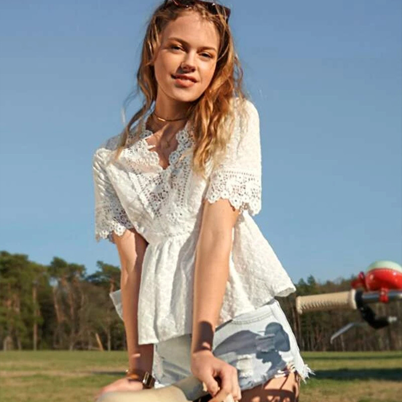アマゾン速売通クロスボーダー新型女装白いvネック刺繍シャツレース刺繍aウエスト上着