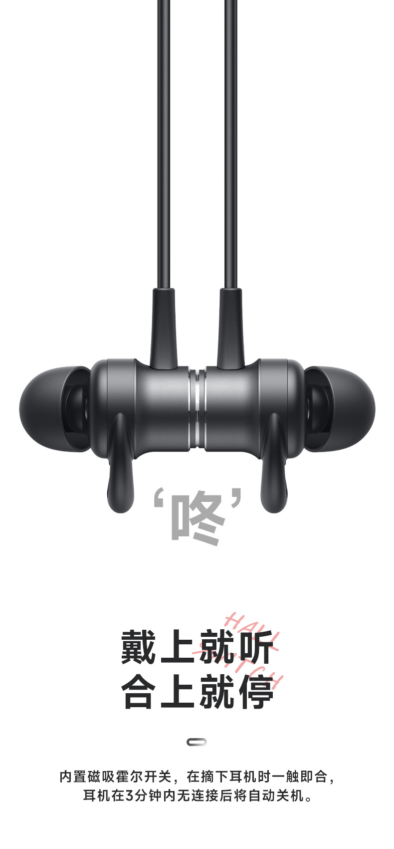 新型ブルートゥースイヤホンは首をかけて耳栓式に入ります。
