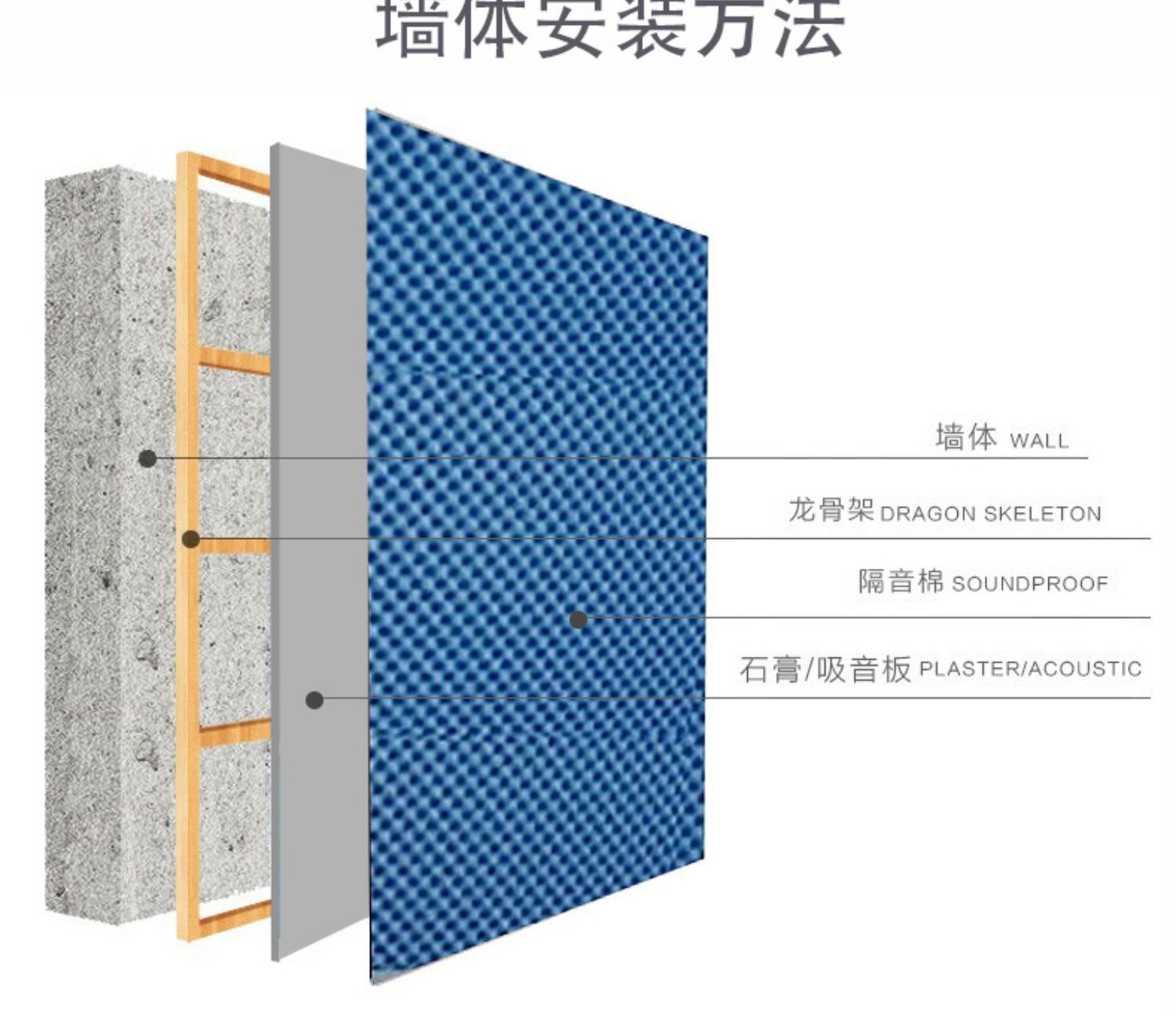 防音綿は壁を貼って、室内の壁体の竜骨から吸音綿を充填します。
