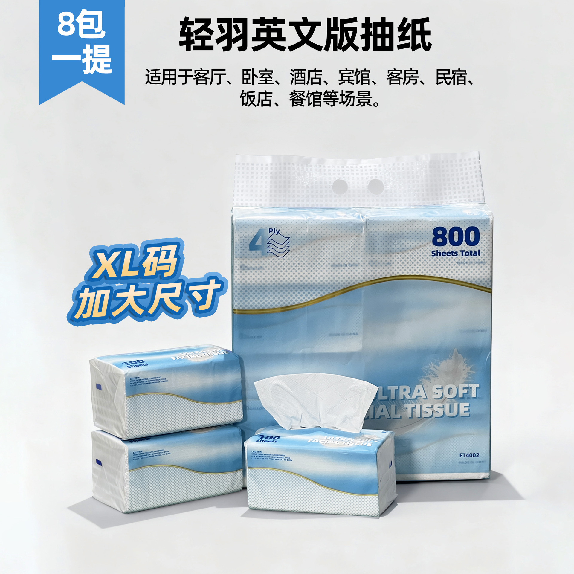 外贸抽纸餐巾纸8包原木浆柔软亲肤4层加厚面巾纸英文包装出口拼柜
