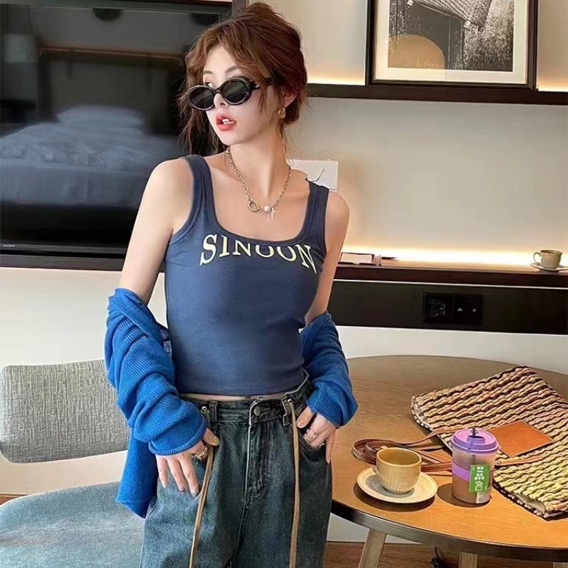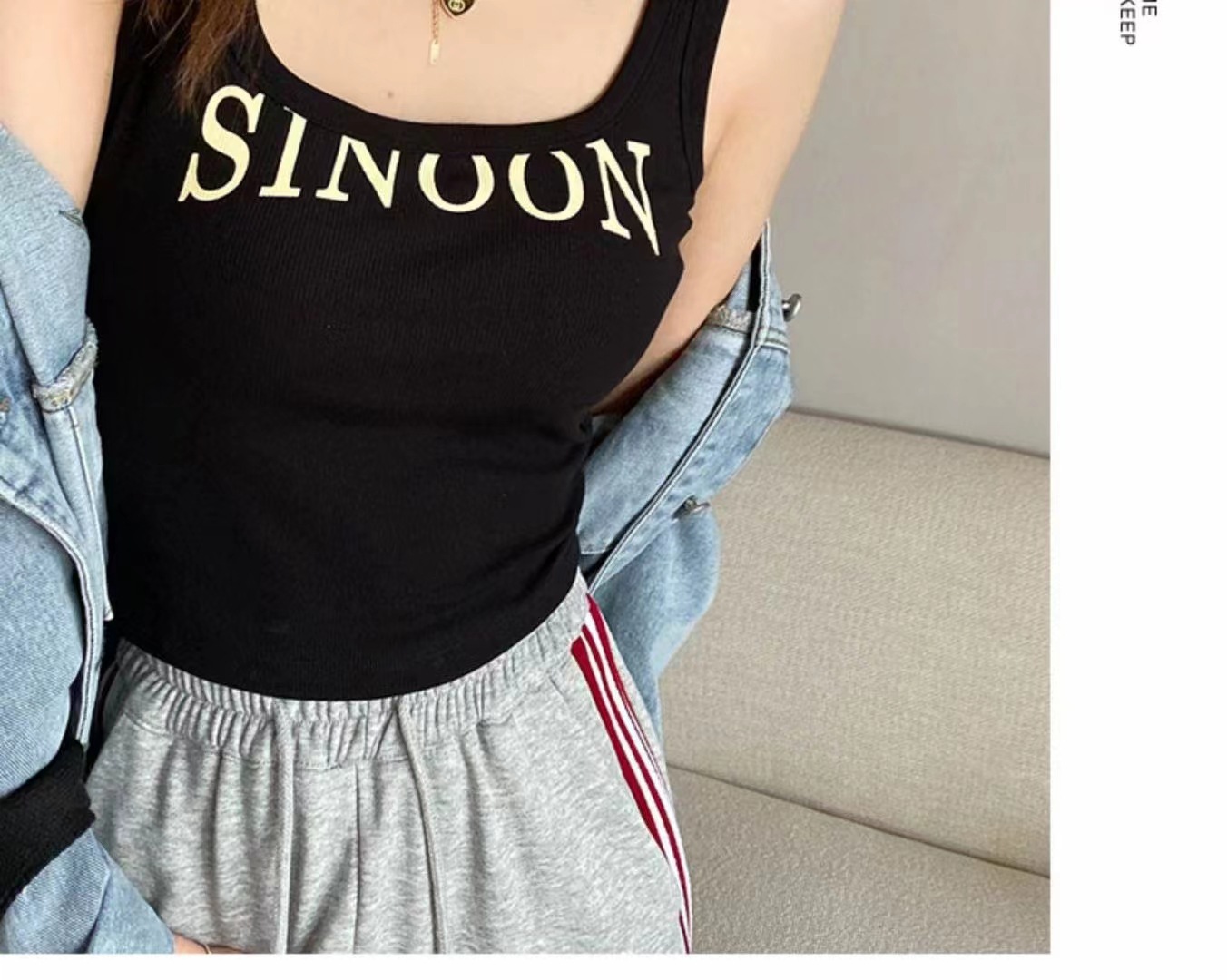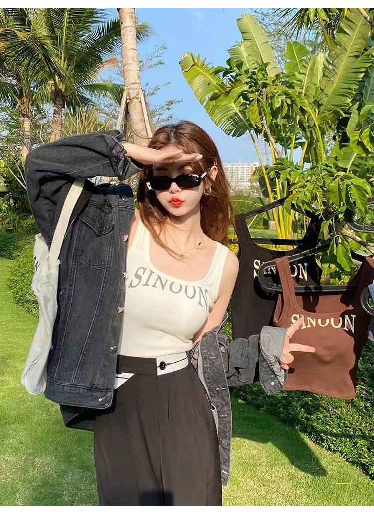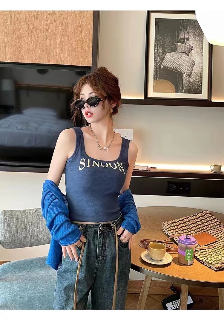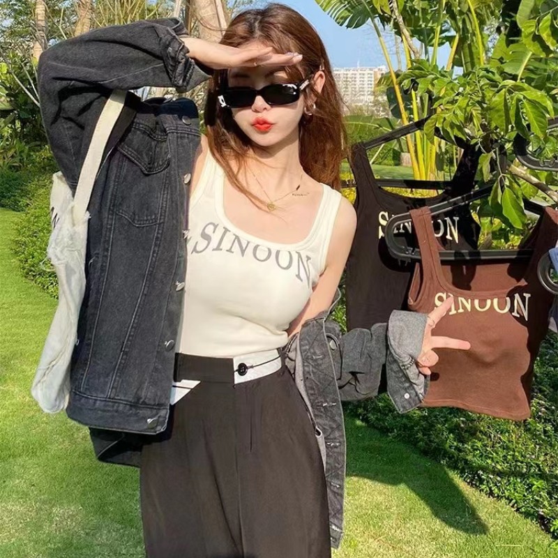 ファッション的な方襟のセクシーなギャルの中には、シックなベストの外に美背のノースリーブtシャツのストラップを着て、上着のファッションがあります。