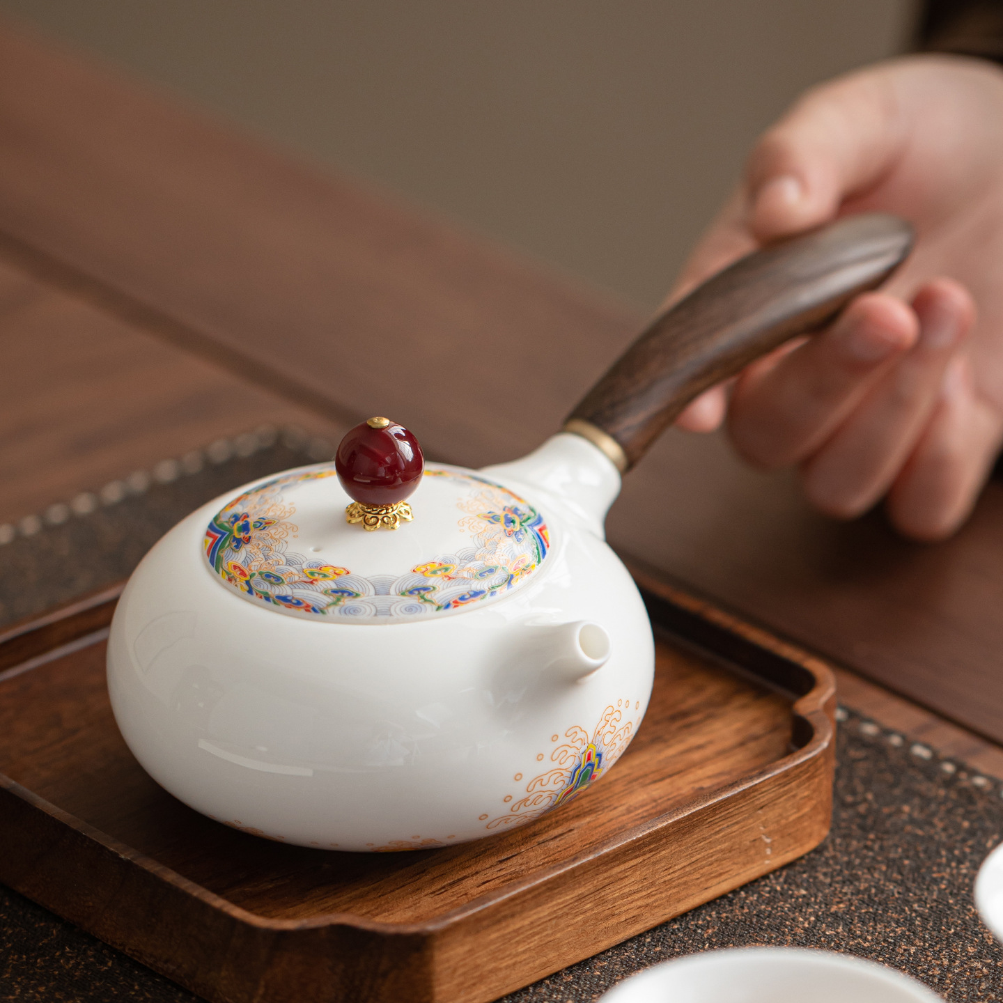 羊脂翡翠家庭用セラミックカンフーティーセットハイエンドティーサイドハンドルティーポットシングルポットハンドル抗火傷卸売