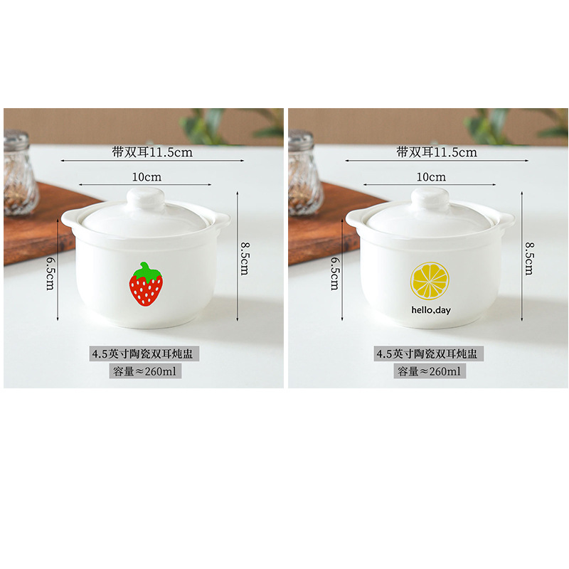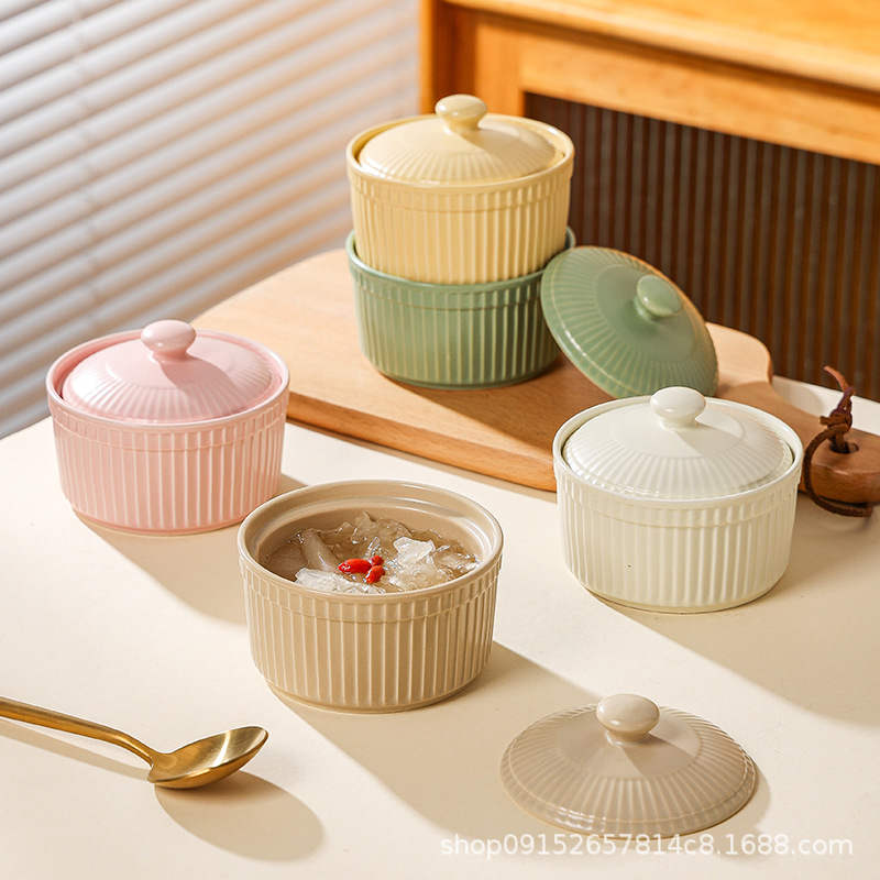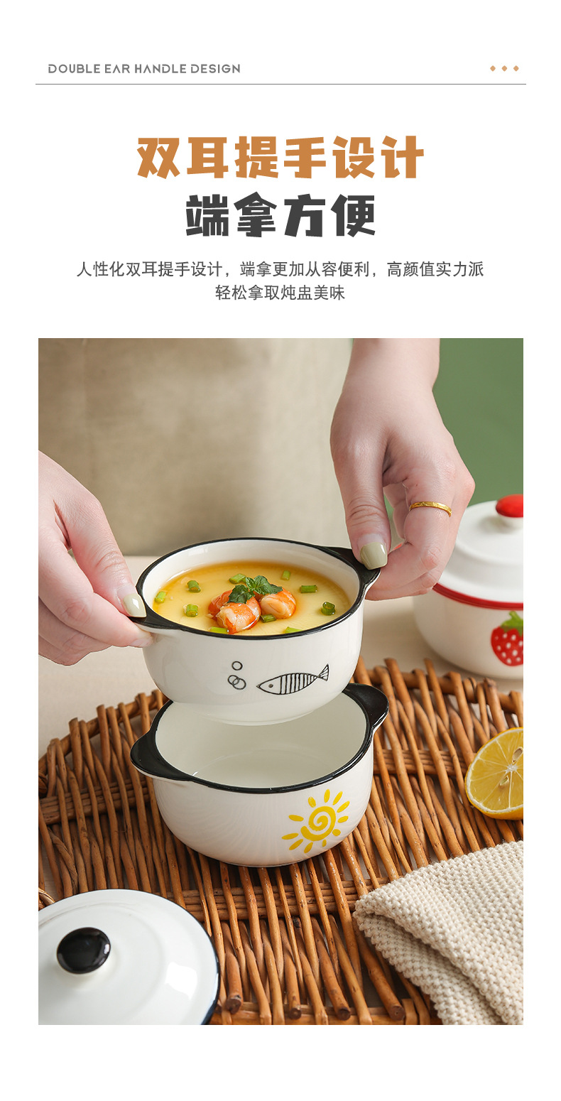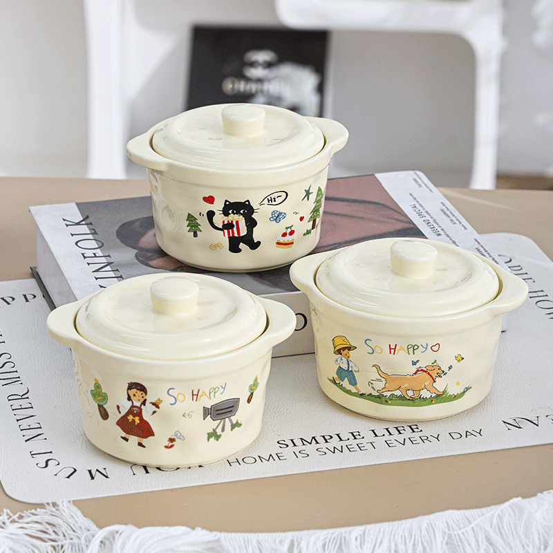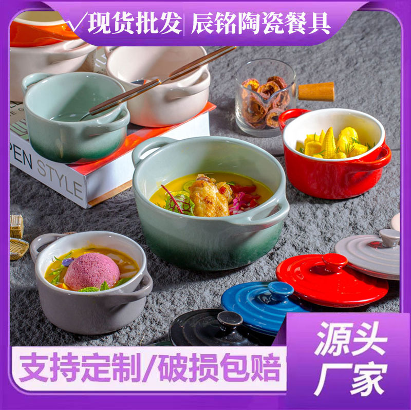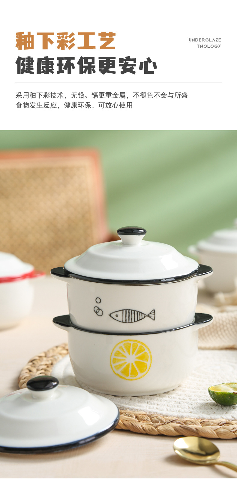 家庭用キッチン電子レンジ対応両耳セラミックベーキングボウル蓋付きスープボウル火傷防止蒸し卵プリンベーキングシチューポット釉下色