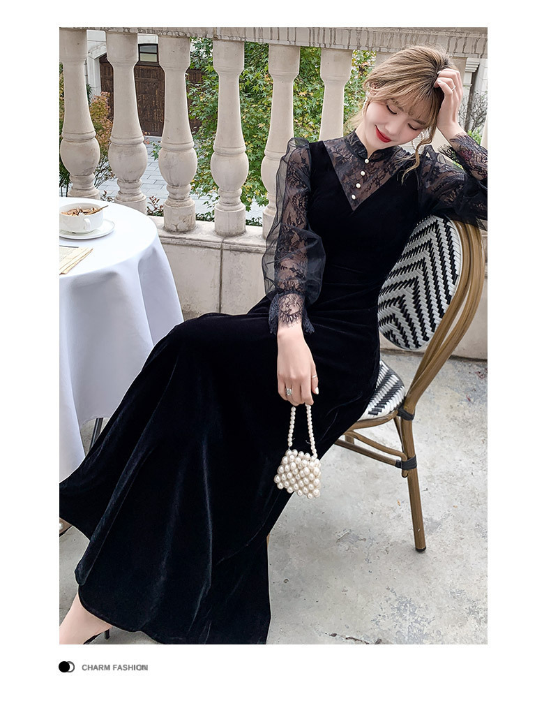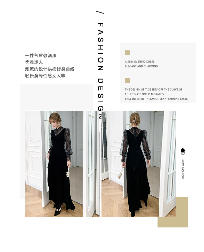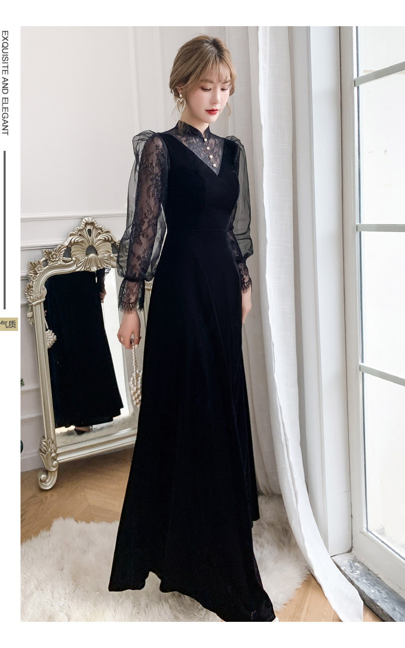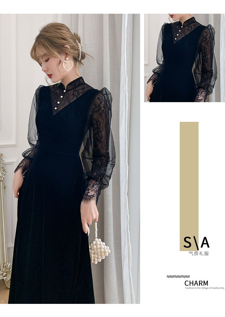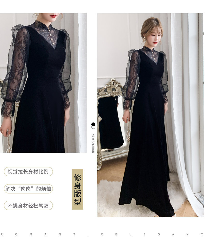 新しい中国風のロングスタンドカラーブラックイブニングドレスライト高級ニッチレース中空長袖普段着ドレス