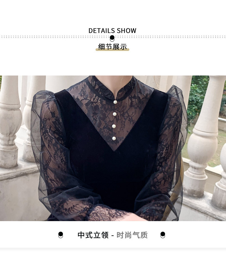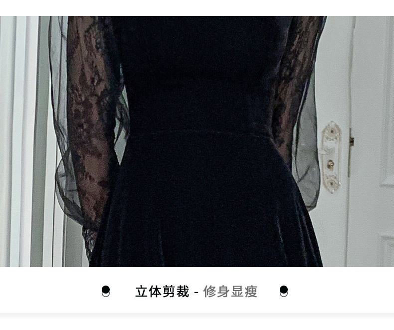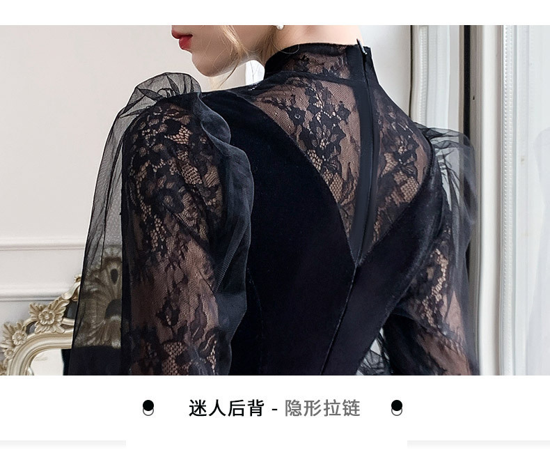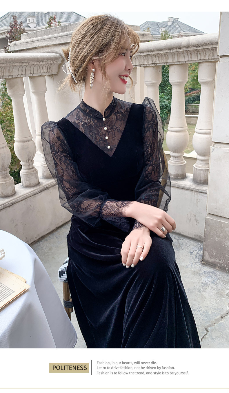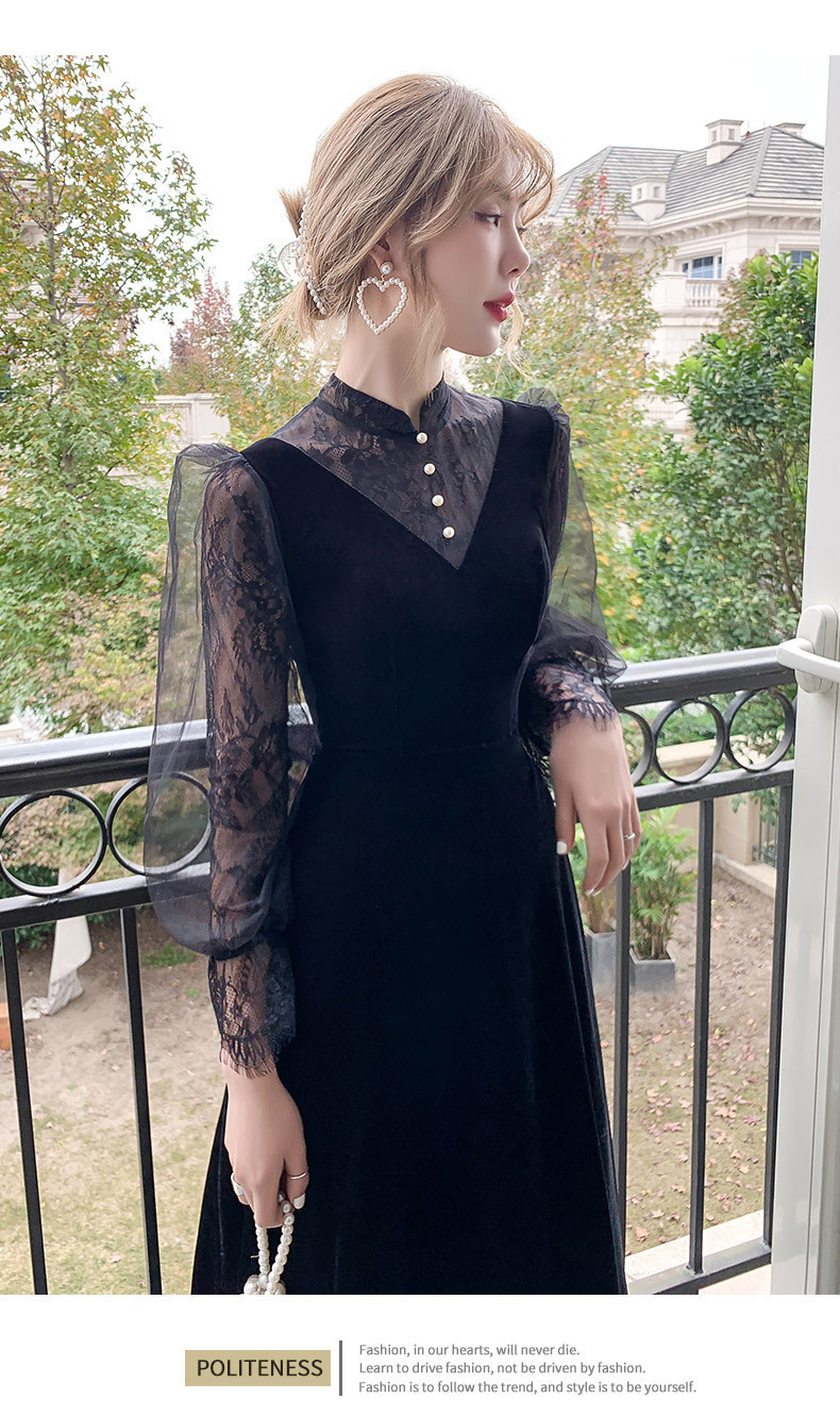 新しい中国風のロングスタンドカラーブラックイブニングドレスライト高級ニッチレース中空長袖普段着ドレス
