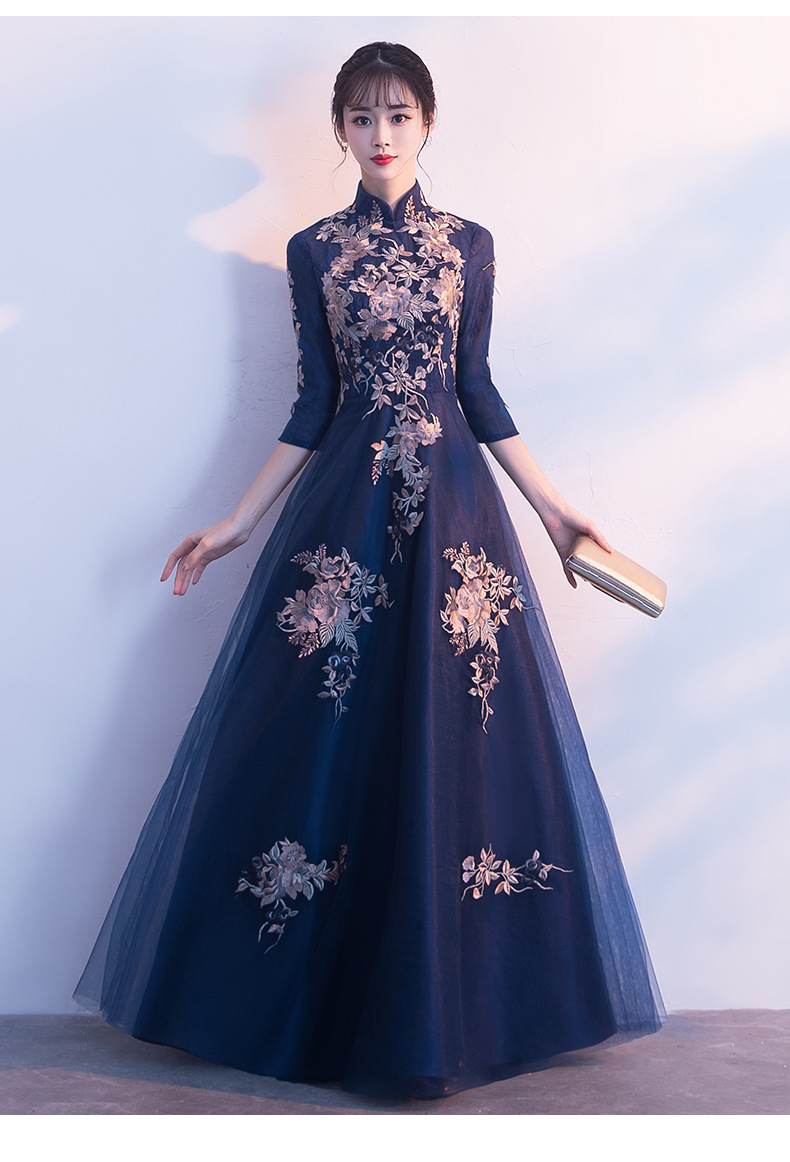 中国式のタキシードの女性の2024新型の高貴な宴会の司会者の気質の長い長のチャイナドレスの大きい合唱はスカートの女性を演出します。