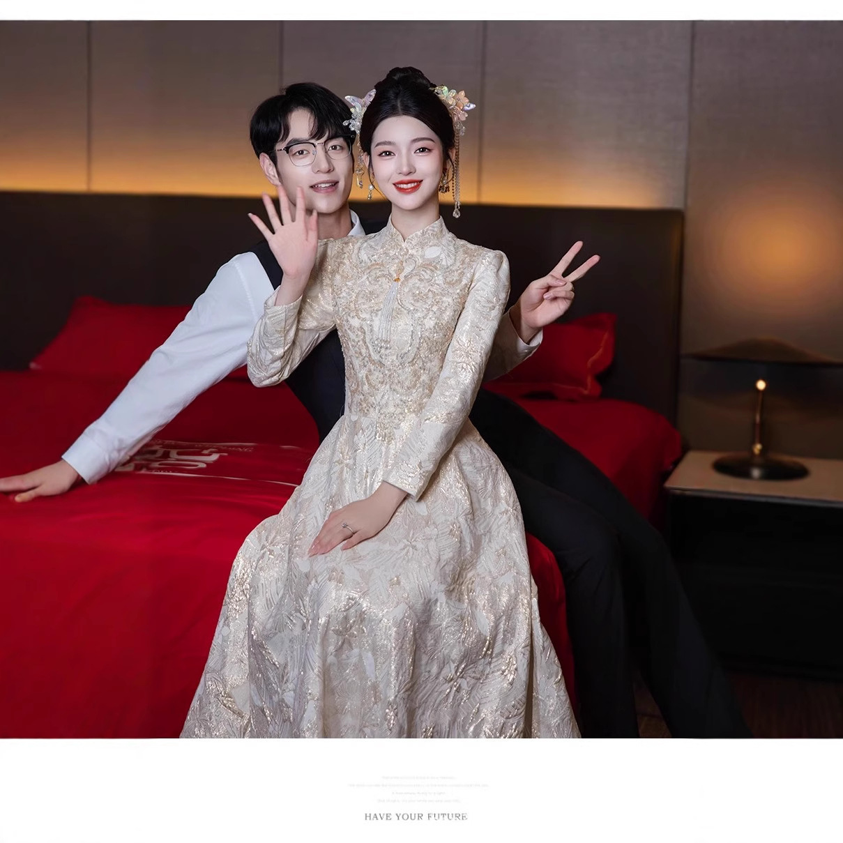 新しい中国式の婚約タキシードの女性司会者の夏のシャンパン色の高級な軽豪華な乾杯服の花嫁の長袖はやせています。