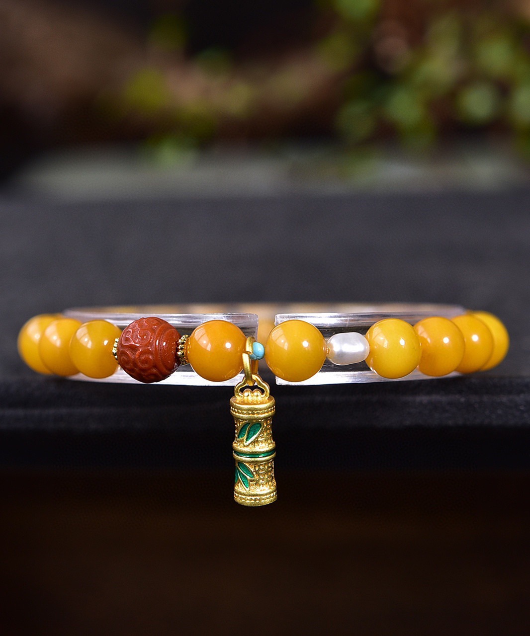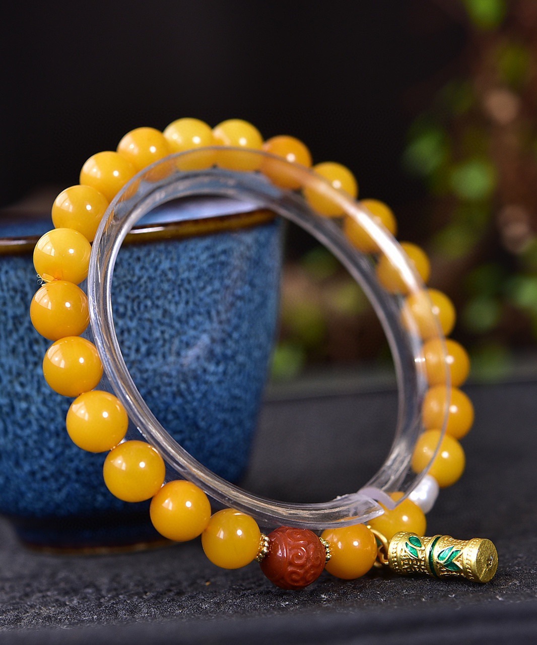 天然鶏油黄蜜ろう手串と南紅瑪瑙節高銀飾りサイズ約7ミリ重約9グラム