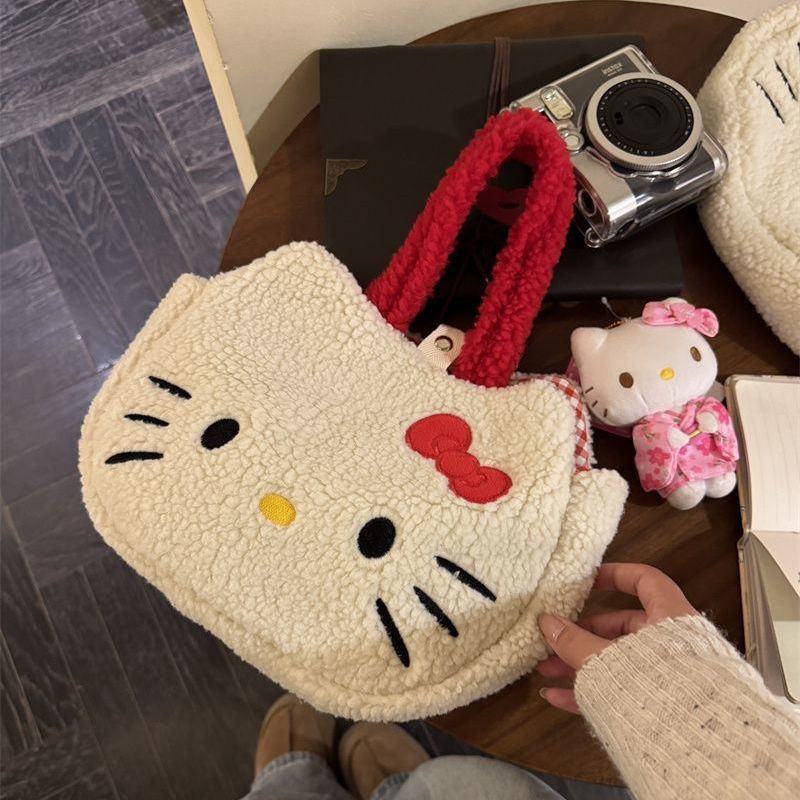 可爱Kitty秋冬猫咪手提包羊羔格子手腕卡通上班通勤包包手拎包女