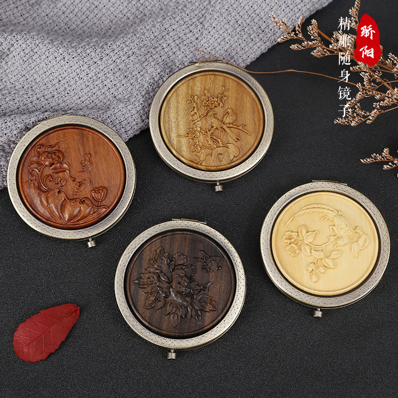新しい化粧鏡緑檀木携帯化粧鏡の美しい円形の小さい鏡の復古的な折り畳みの花梨木の贈り物