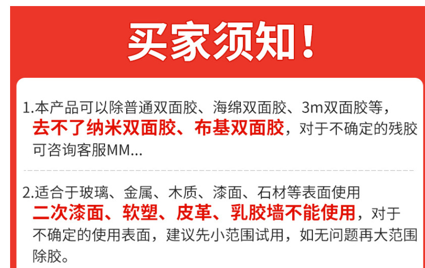 【适用表面】木材/漆面/金属/大理石/陶瓷/玻璃等二次漆面、软塑、皮革、乳胶墙不能使用,对于不确定的使用表面,建议先小范围试用,如无问题再大范围