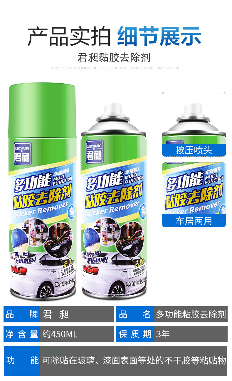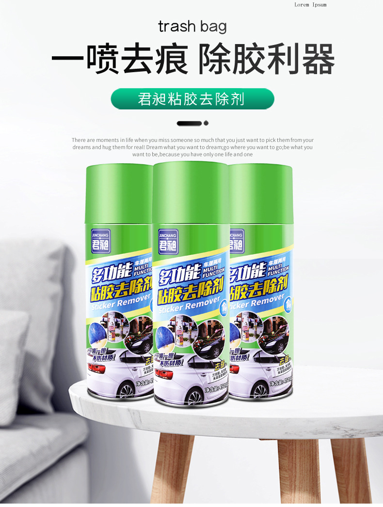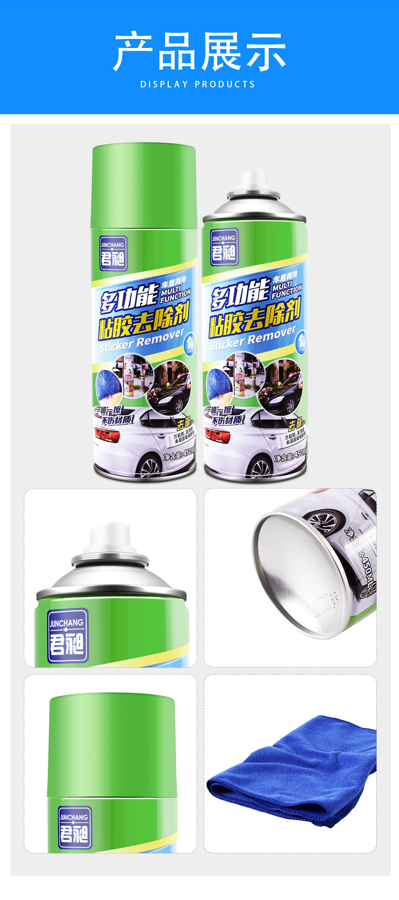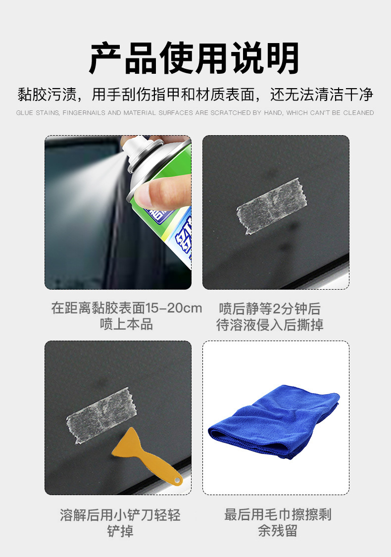 【使用方法】:①使用前充分摇匀;②距物体表面15~25cm处均匀喷射;③直接喷射到柏不干胶等胶渍上,待30秒后再用干净软布或小刮板将污渍擦干净即可。