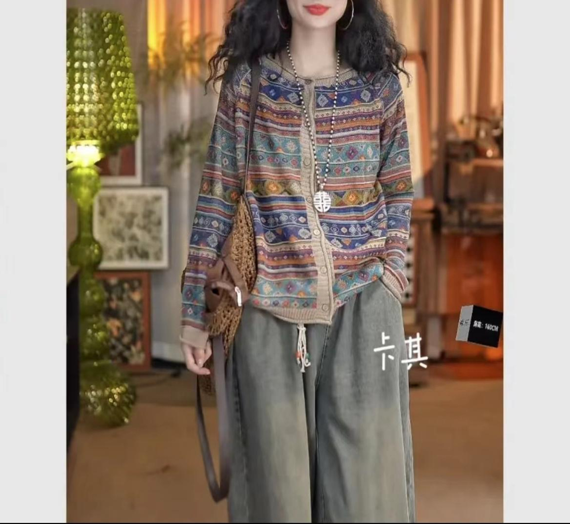 オリジナル【9007】早秋おしゃれ洋風コットン糸ボヘミアン風デザイン感長袖ニットカーディガン