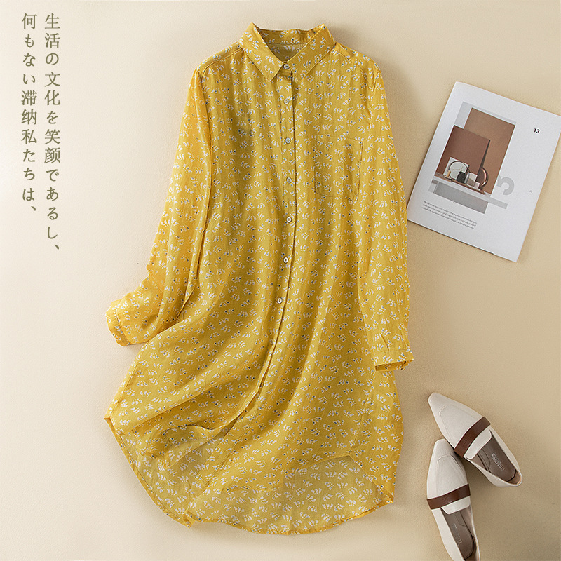 ゆったりとした痩せたプリントシャツの女性の秋の新商品の清新な綿麻長袖の中の長いカーディガン