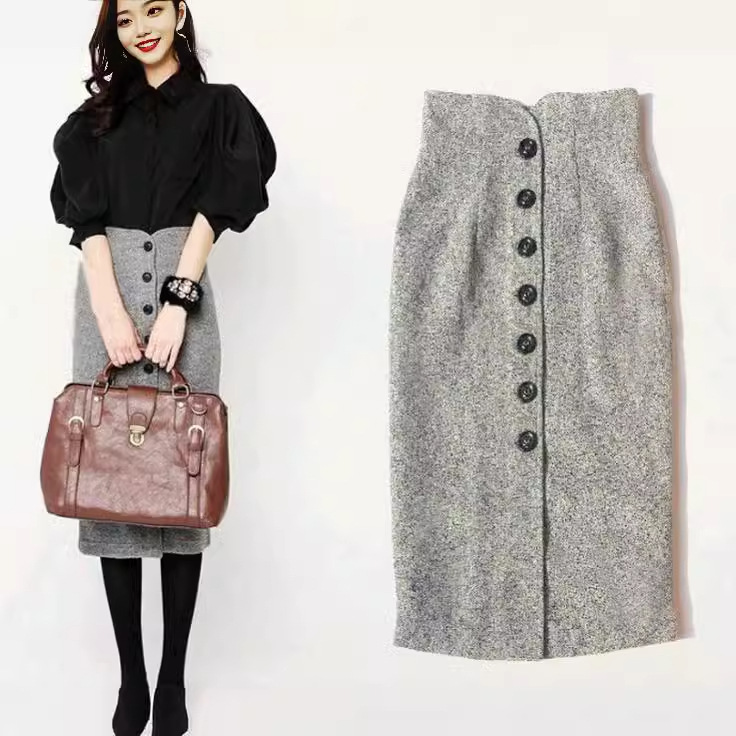 春、秋、冬の新作ウールハイウエストレトロヒップカバースリムミディスカート