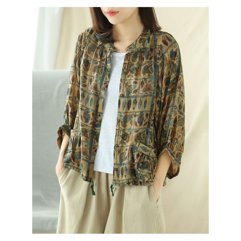 复古印花棉麻衬衫2025春秋季新款文艺百搭大码宽松显瘦衬衣女