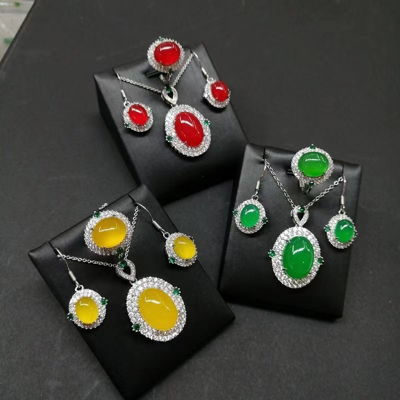 模造玉天然瑪瑙祖母緑アクセサリーセットイヤリングリングペンダント樹脂エメラルドグリーン気質女性アクセサリー