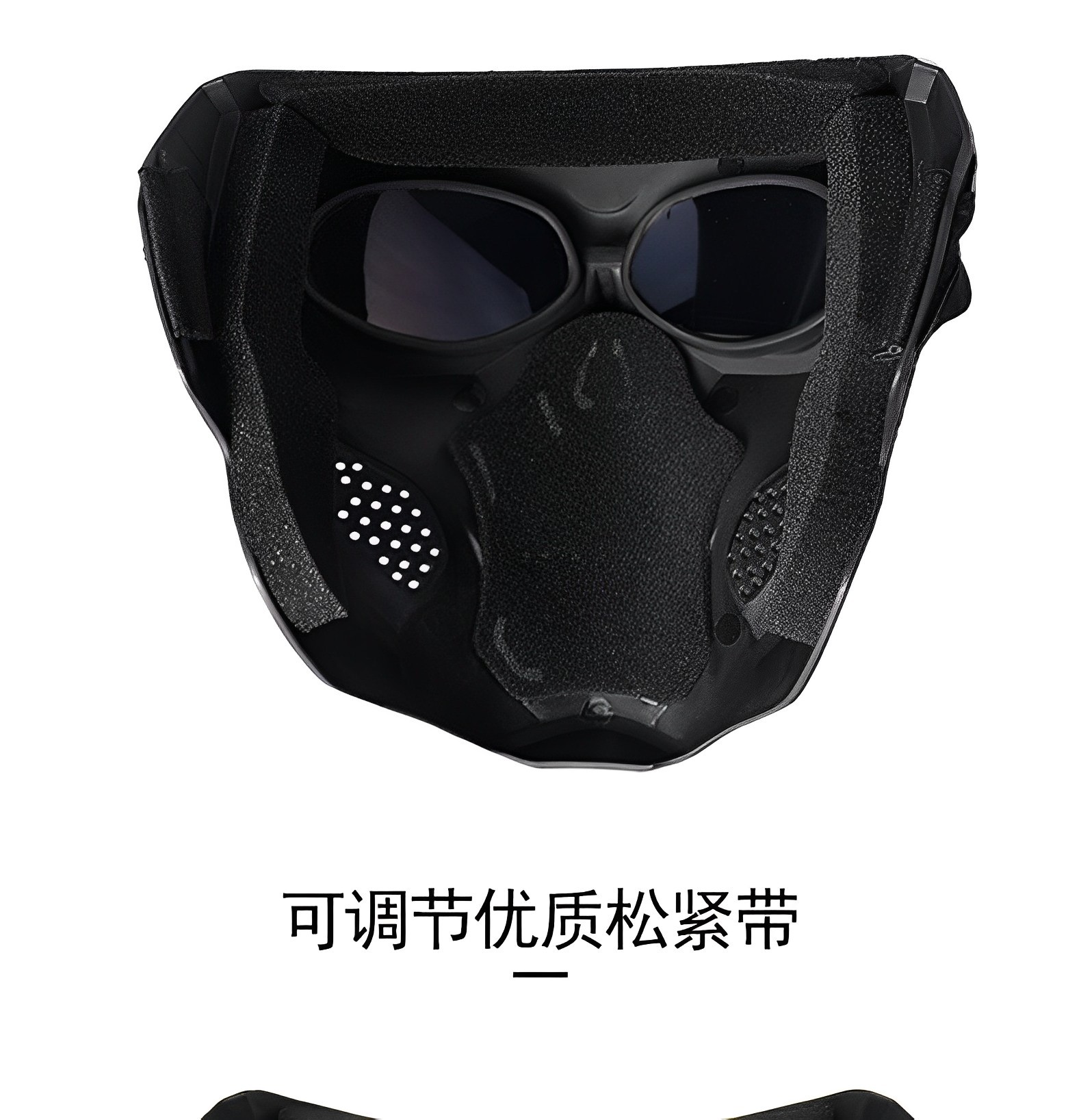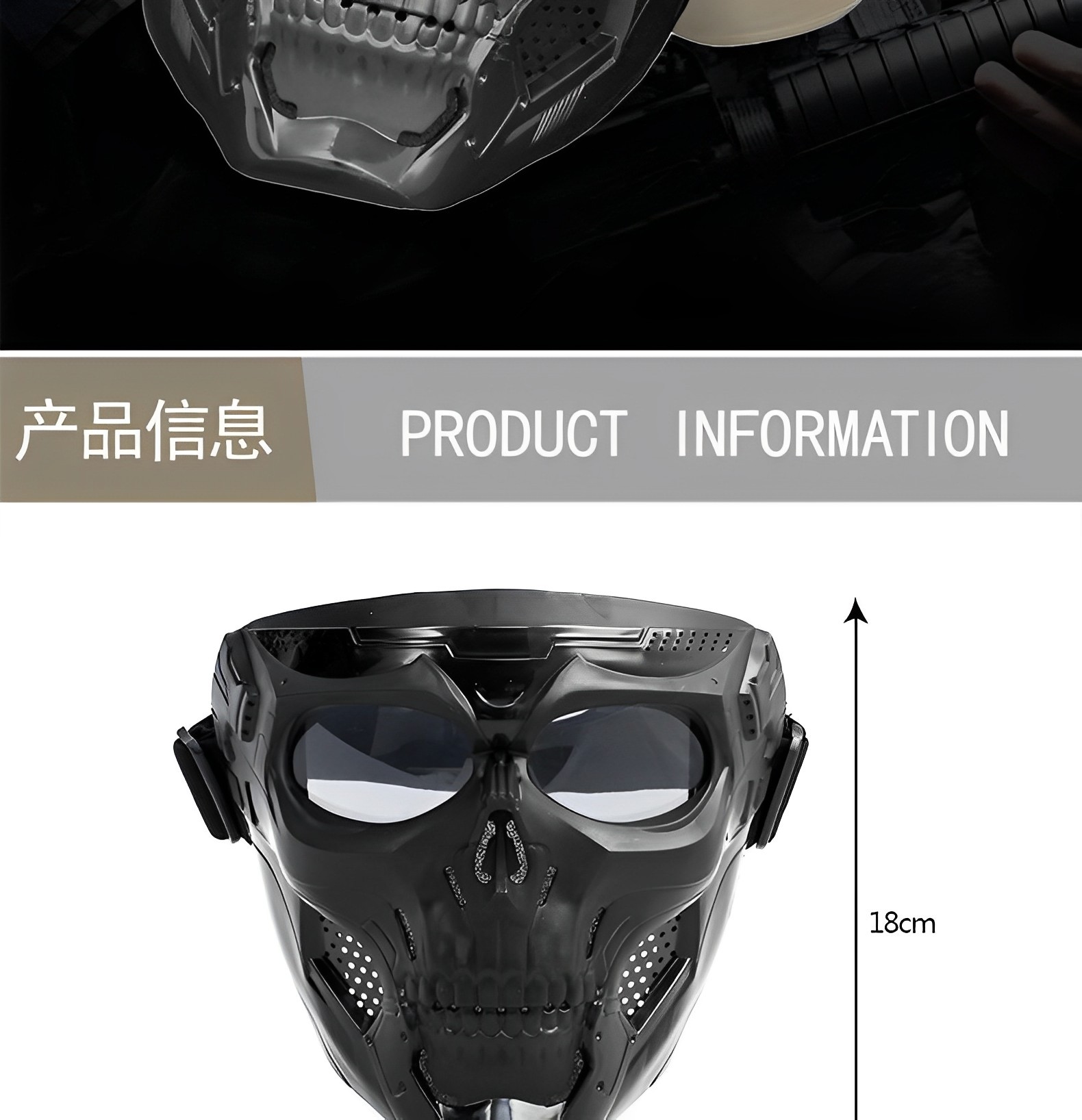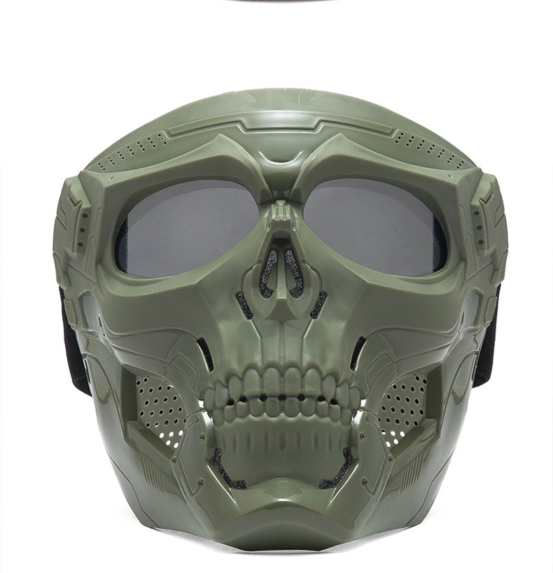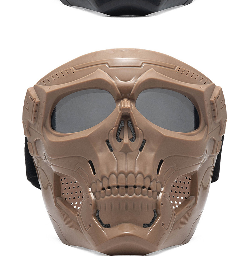 产品卖点: 以其独特的骷髅形象设计,让你与众不同,给予强烈的视觉冲击力,让你在人群中脱颖而出;产品通风透气,内衬附有缓震海绵,让佩戴更舒适;镜片使用PC材质,保护眼部更耐冲击防风沙;适用于各种场合和活动,如派对,真人cs,演出等;