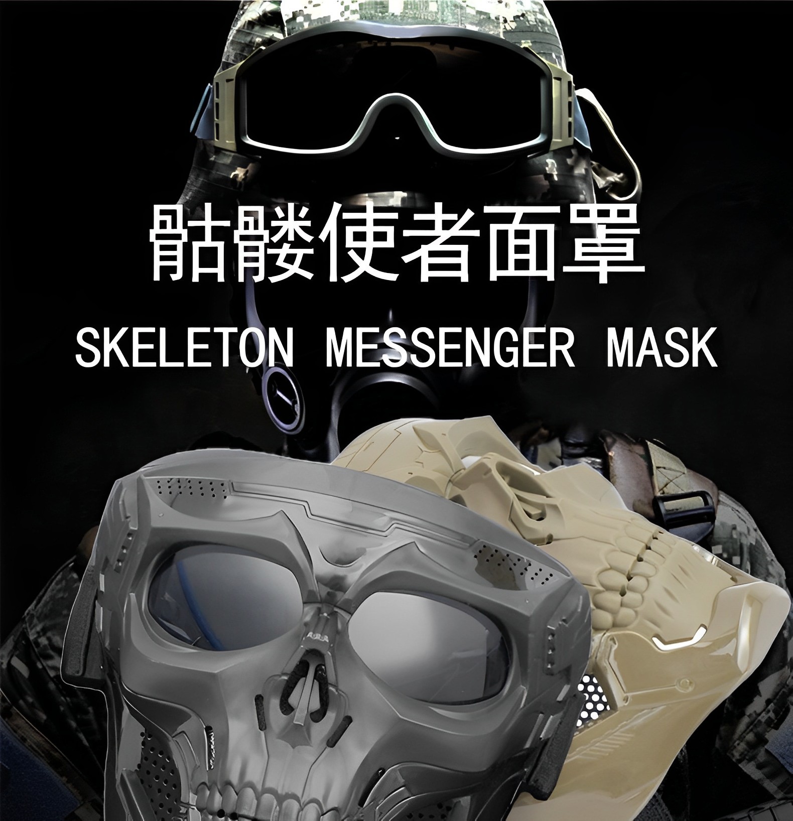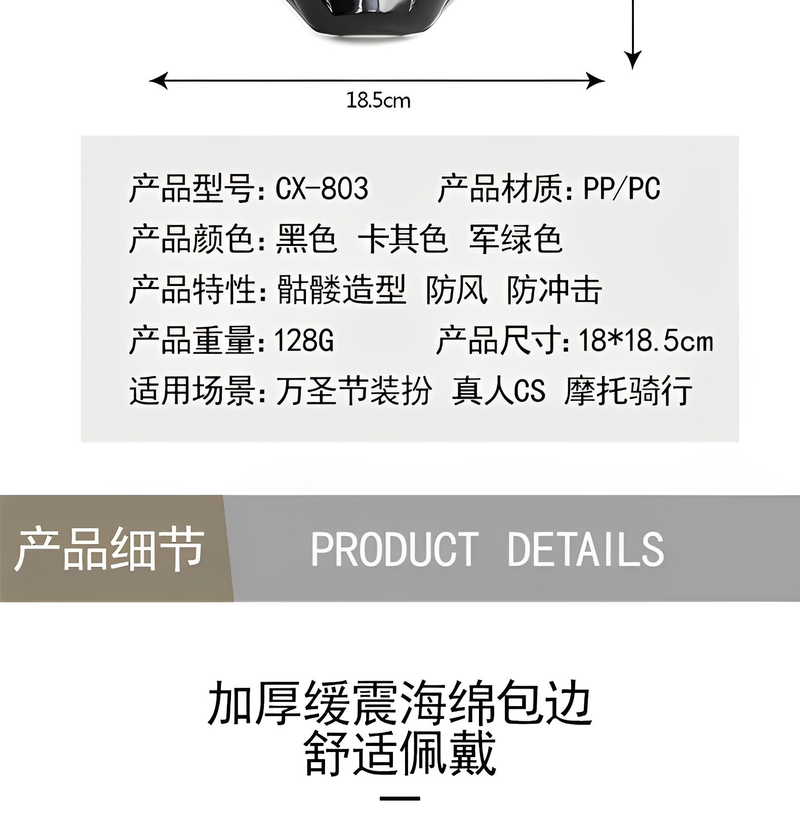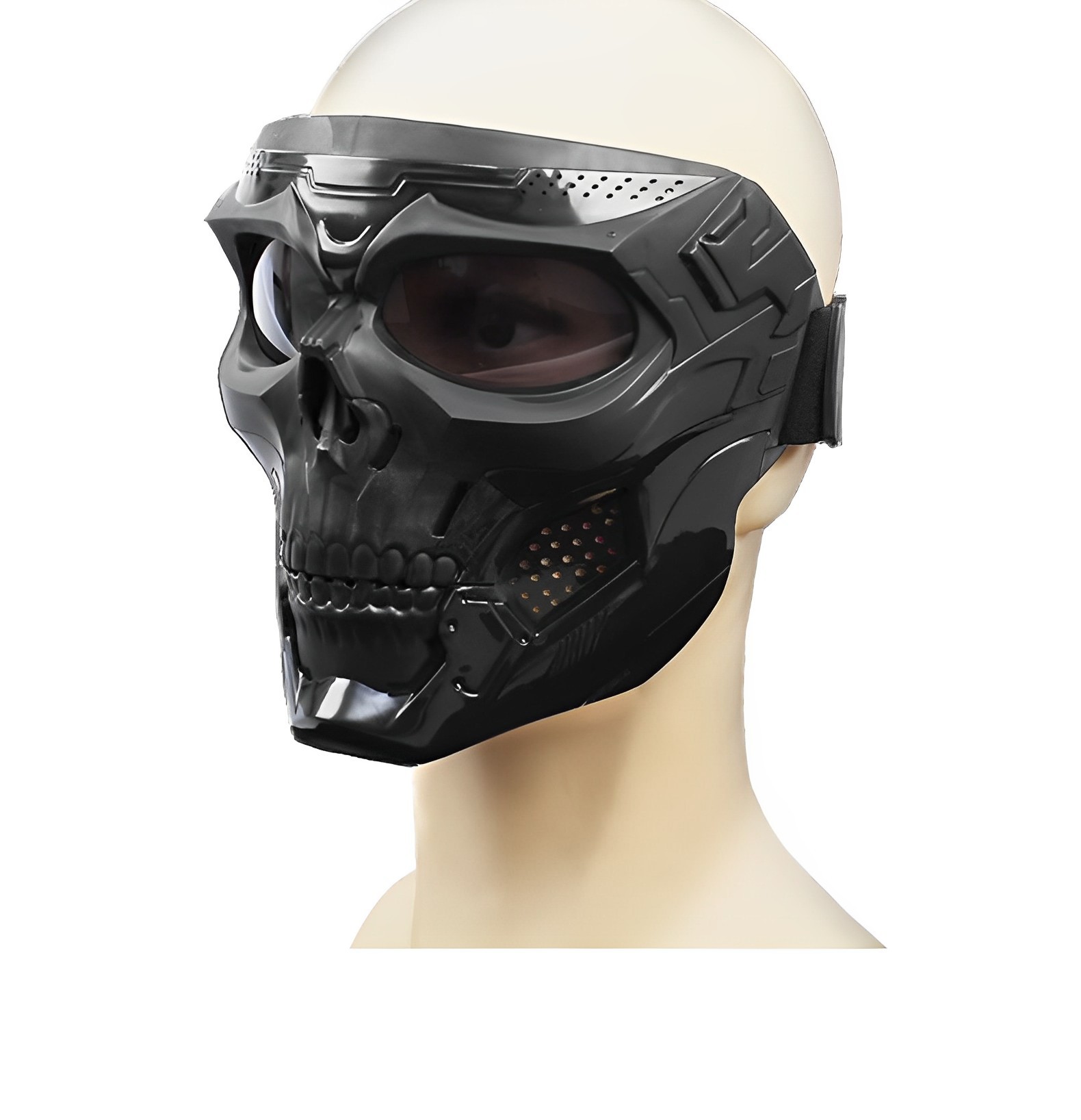 产品卖点: 以其独特的骷髅形象设计,让你与众不同,给予强烈的视觉冲击力,让你在人群中脱颖而出;产品通风透气,内衬附有缓震海绵,让佩戴更舒适;镜片使用PC材质,保护眼部更耐冲击防风沙;适用于各种场合和活动,如派对,真人cs,演出等;