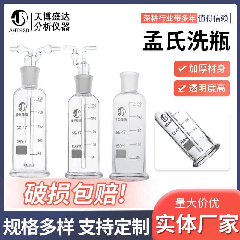 ガラス洗浄瓶125/250/500ml、音響練習用ボトル、多孔質直管洗浄ボトル、吹き込みボトル、洗浄ボトル