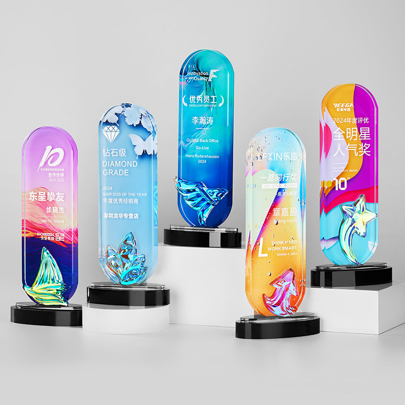 新商品のカラークリスタルのトロフィーをカスタマイズして、高級大気年会で優秀な従業員の栄誉賞杯を授賞します。