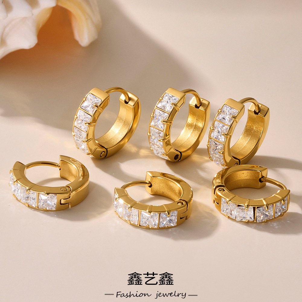 欧美轻奢白锆耳扣时髦气质镶钻耳钉女不锈钢方形锆石耳环外贸专供
