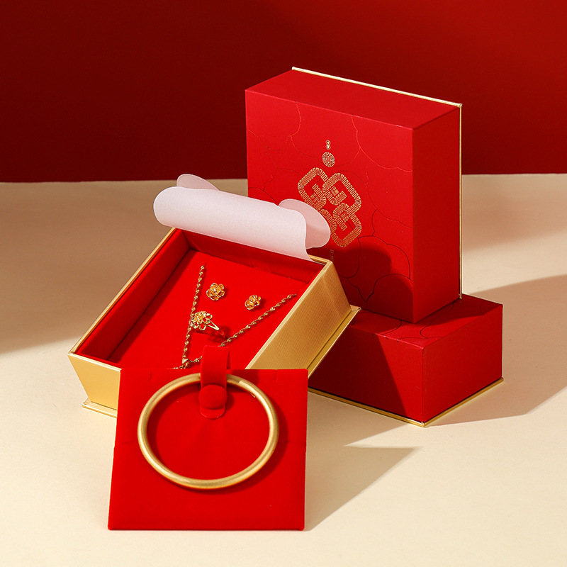 赤いネックレスのチェーンボックスの黄金の手のひものギフトボックスは、金のアクセサリーの箱の翡翠のブレスレットを開けて箱を収納します。