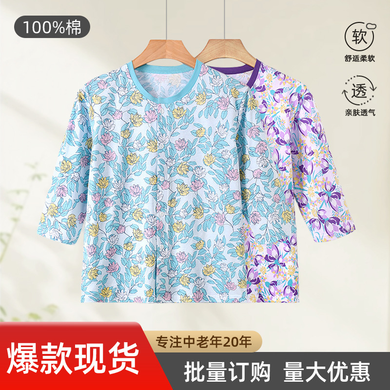 レディース七分袖カーディガン、中高年向けTシャツ、純綿、夏用薄手、ゆったり、高齢者向け大きいサイズ、プリント、おばあちゃん服