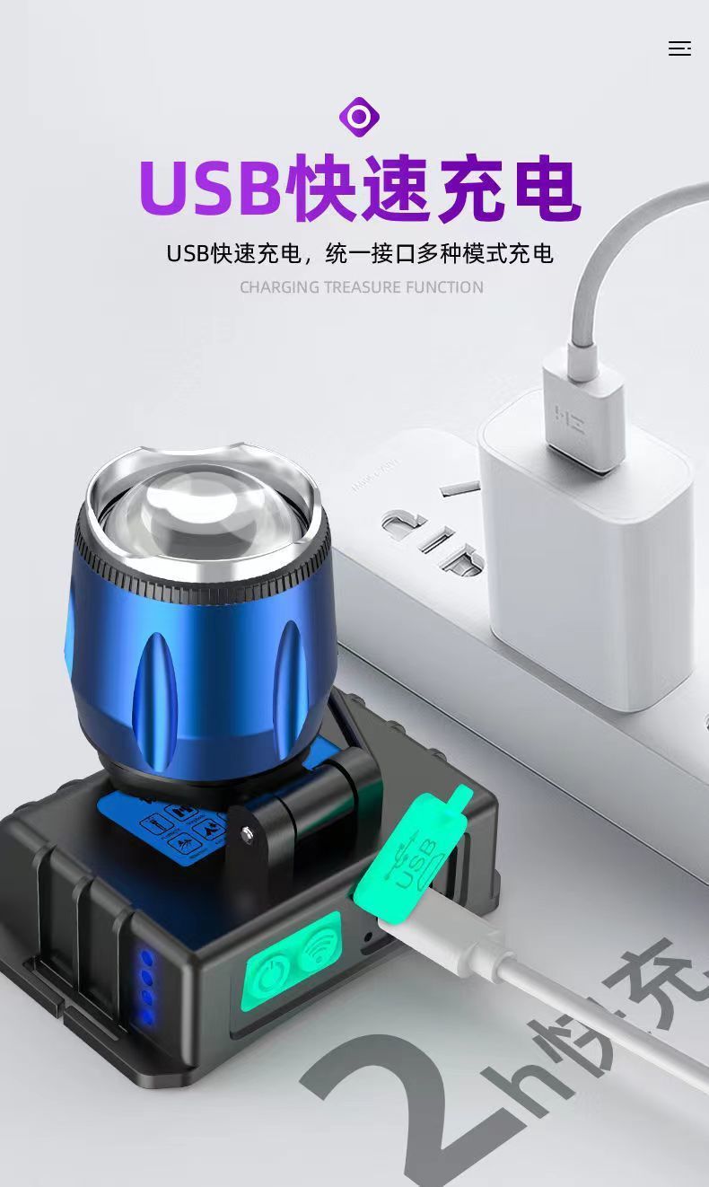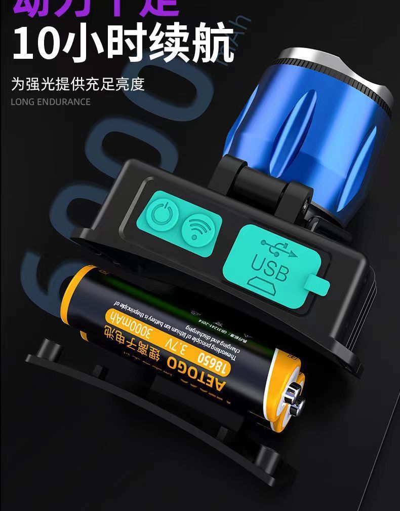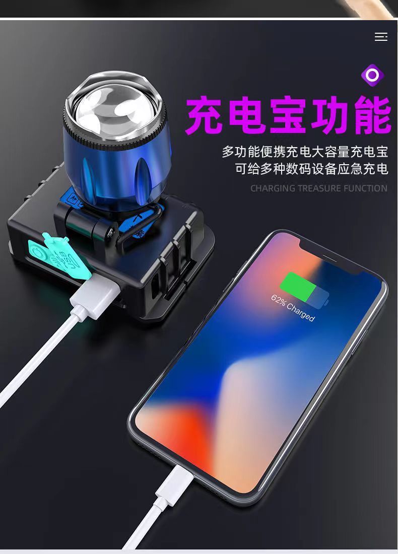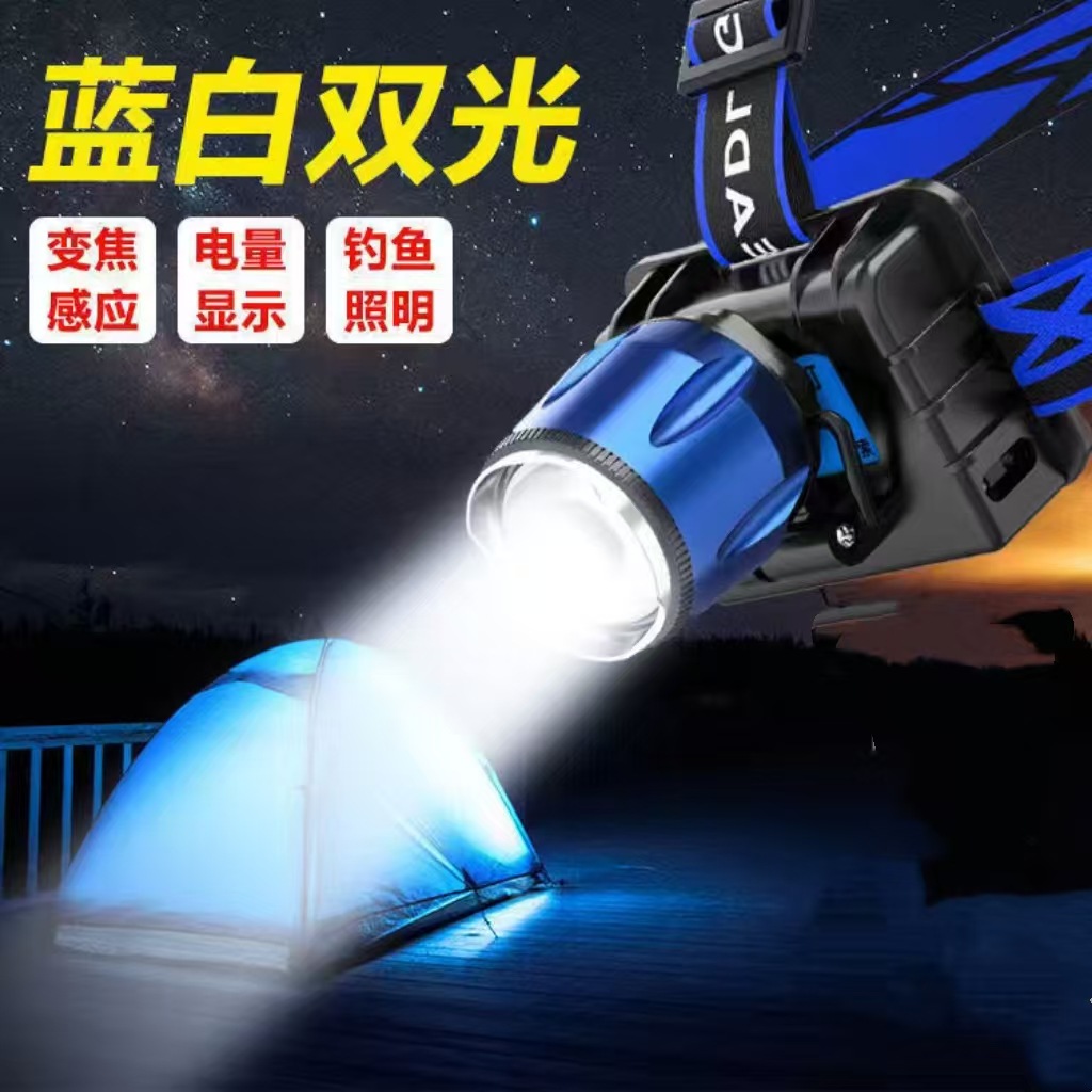 超亮感応ヘッドライト白青双光源照サソリ灯は携帯電話の屋外用LED照明大電力鉱灯を充電することができます。