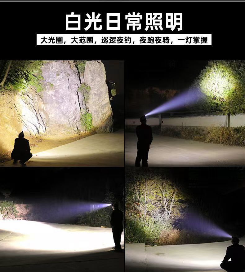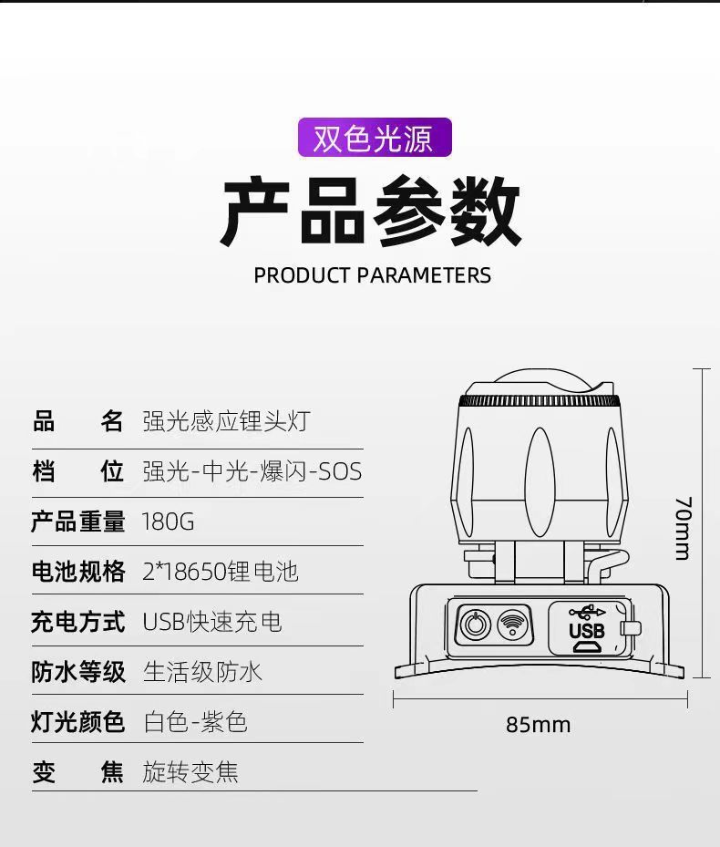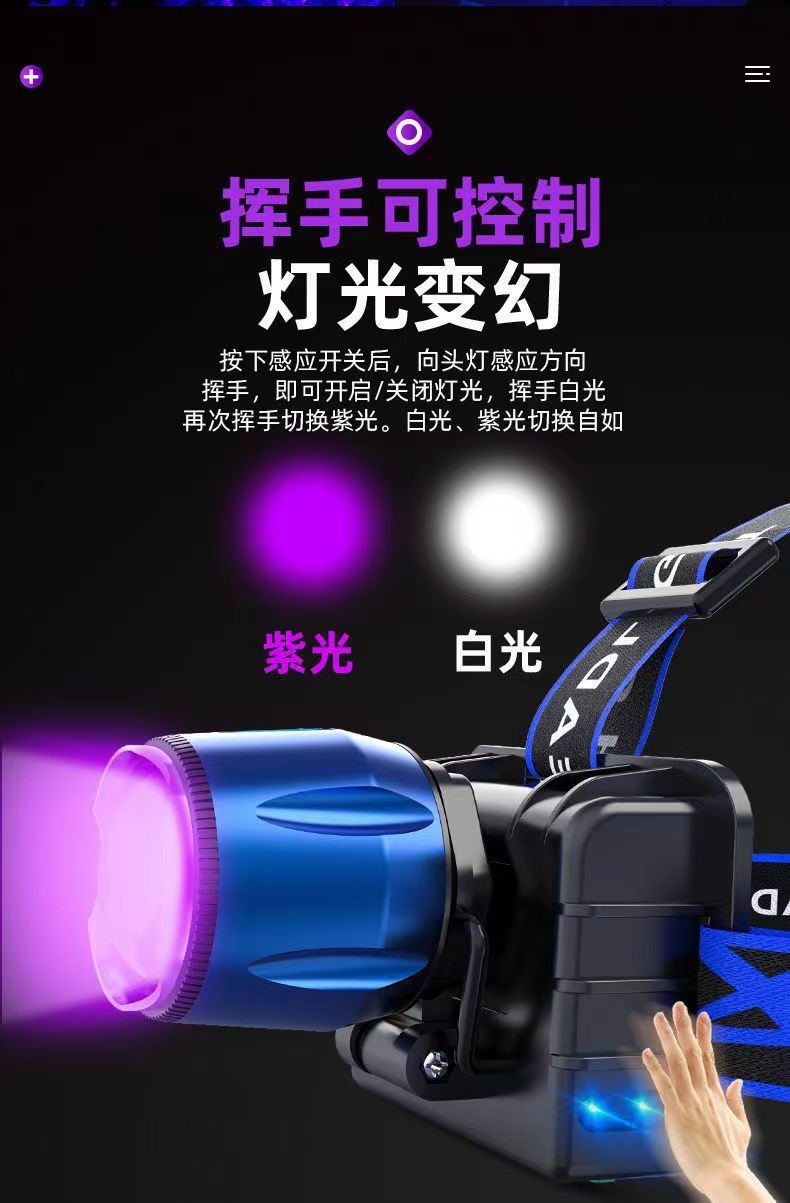 白紫双光源帯感応ヘッドライト充電可能な大出力強光遠射200メートル家庭用屋外led釣り