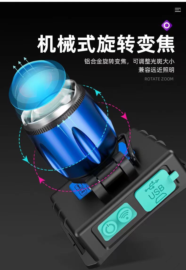 超亮白紫光ヘッドライトサソリランプズーム強い光遠射充電可能屋外釣り大電力ロング航続
