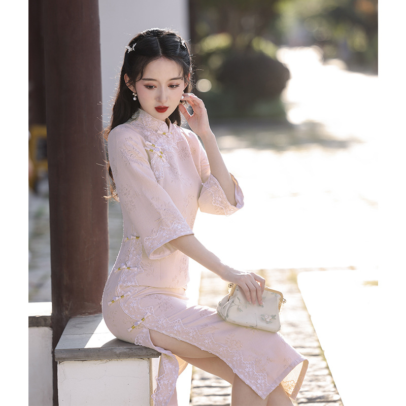若いタイプの少女チャイナドレスの新型2023春秋ピンクの婚約朝着を改良した新中国式日常は夏を着ることができる