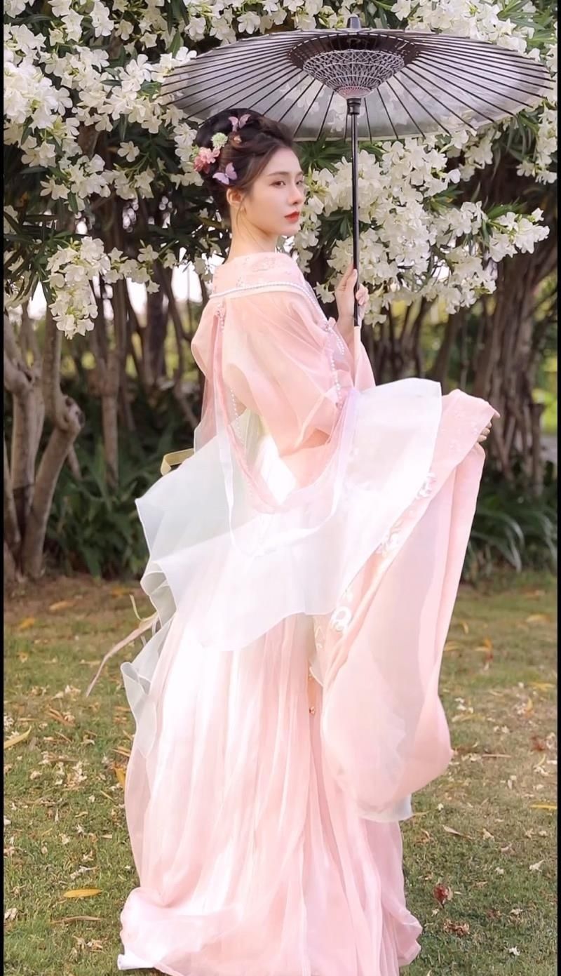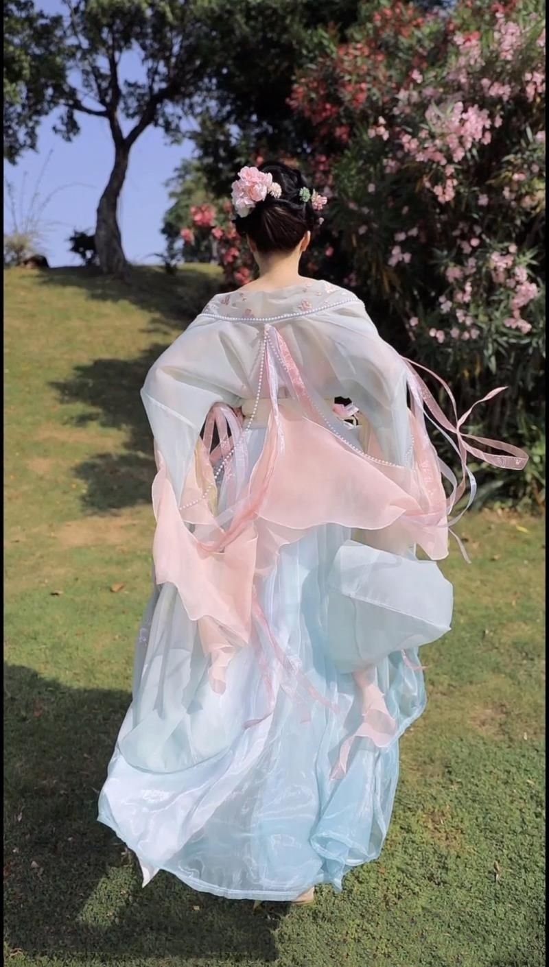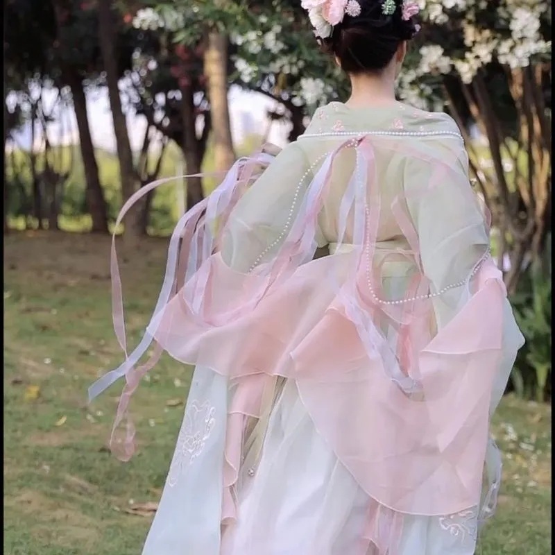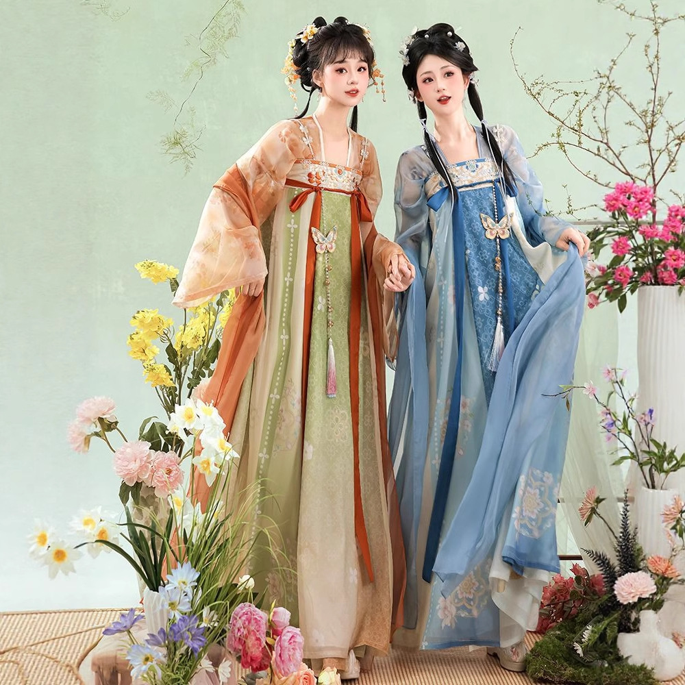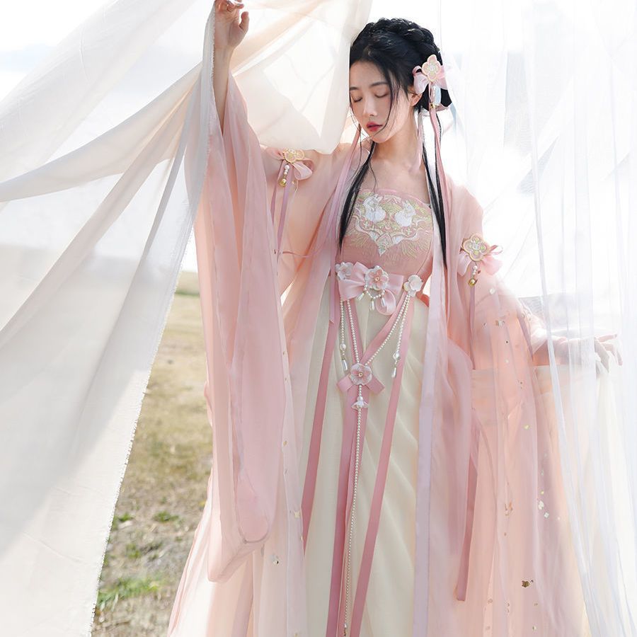 春夏モデル【満天の花雨】漢服の女性唐製の胸の細いスカートの刺繍の大きい袖のシャツの清新な日常の古着